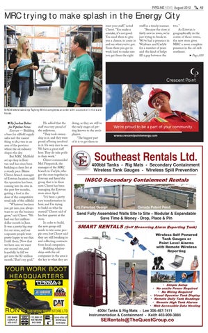 By Jordan Baker for Pipeline News Estevan — Building a base for oilfield supply sales isn’t the easiest thing to do, even in an area of the province where the oil industry shapes the day. But MRC Midfield set up shop in Estevan and has since been building a client list at a steady pace. Blaine Chrest, branch manager of Estevan location, said the operation has been coming into its own in the past few months, getting a foot in the door of the competitive retail side of the oilfield. “Whatever business you get into, you always want to see the business grow,” said Chrest. “We had our first milliondollar month in June. It was a pretty big step for our store, and our corporate people were pretty happy to see that. I told them, ‘Now that we have one, we want our second one, and hopefully by fall we get into the $2-million month.’ That’s my goal.”