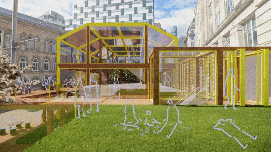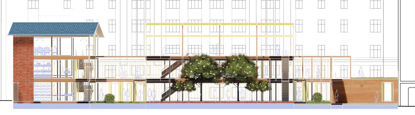 TheCitricGroovetransformsthehistoricPig&Whistleintoa glowing urban treehouse. Centered around a lemon tree hothouse,itfeaturesawalkableupper-levelplatformconnecting workshops, a fermentation lab, and shops Its glazed structure blendsintothestreetbydayandlightsitupbynight