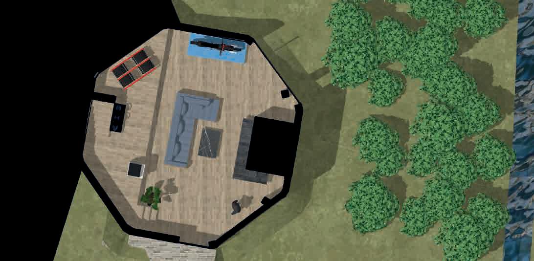 Nace de la continuidad de la forma básica de las cubiertas de las casas vecinas, se adhiere al terreno, con esta misma forma.