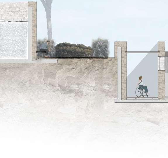 Coupes transversales : Insertion dans la topographie, passages, une fine structure qui s’ancre aux murs de soutènement