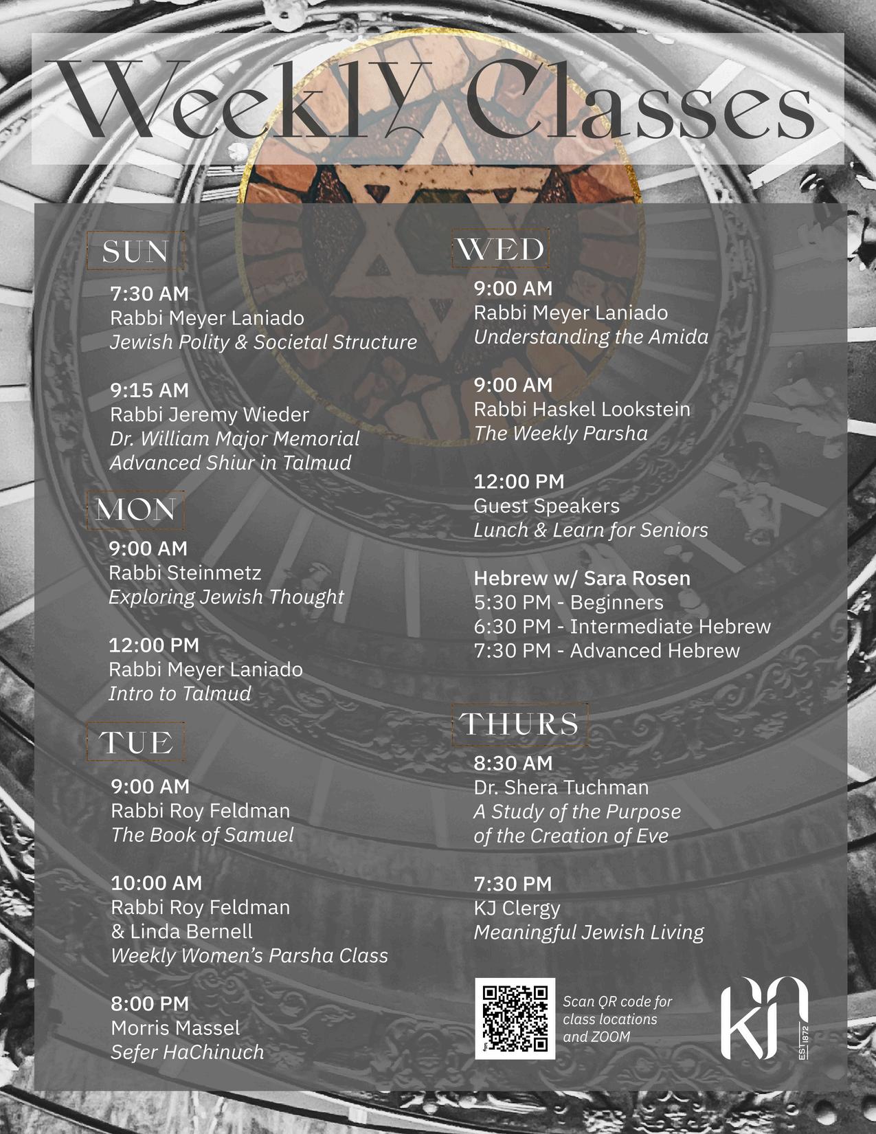 All are invited to join. Kiddush Discussion takes place on Shabbat in KJ’ s Main Sanctuary at 12:00 PM.