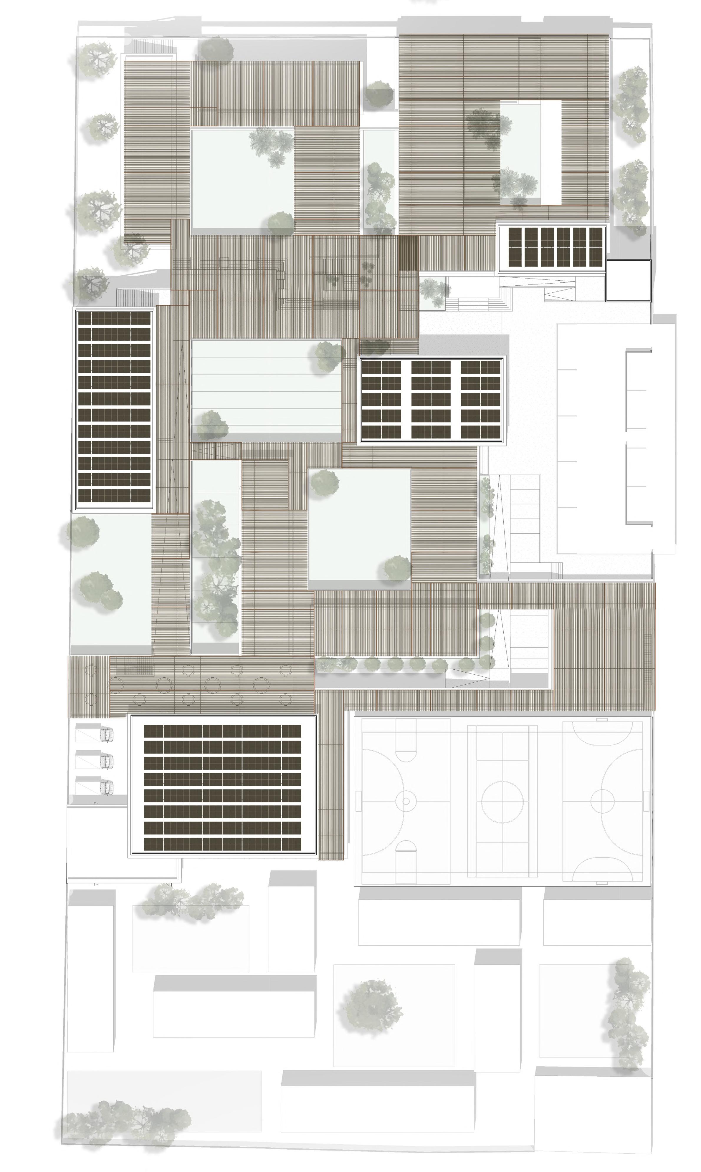 Filtering part of the intense sunlight allows for larger windows with less heat gains inside the classrooms.