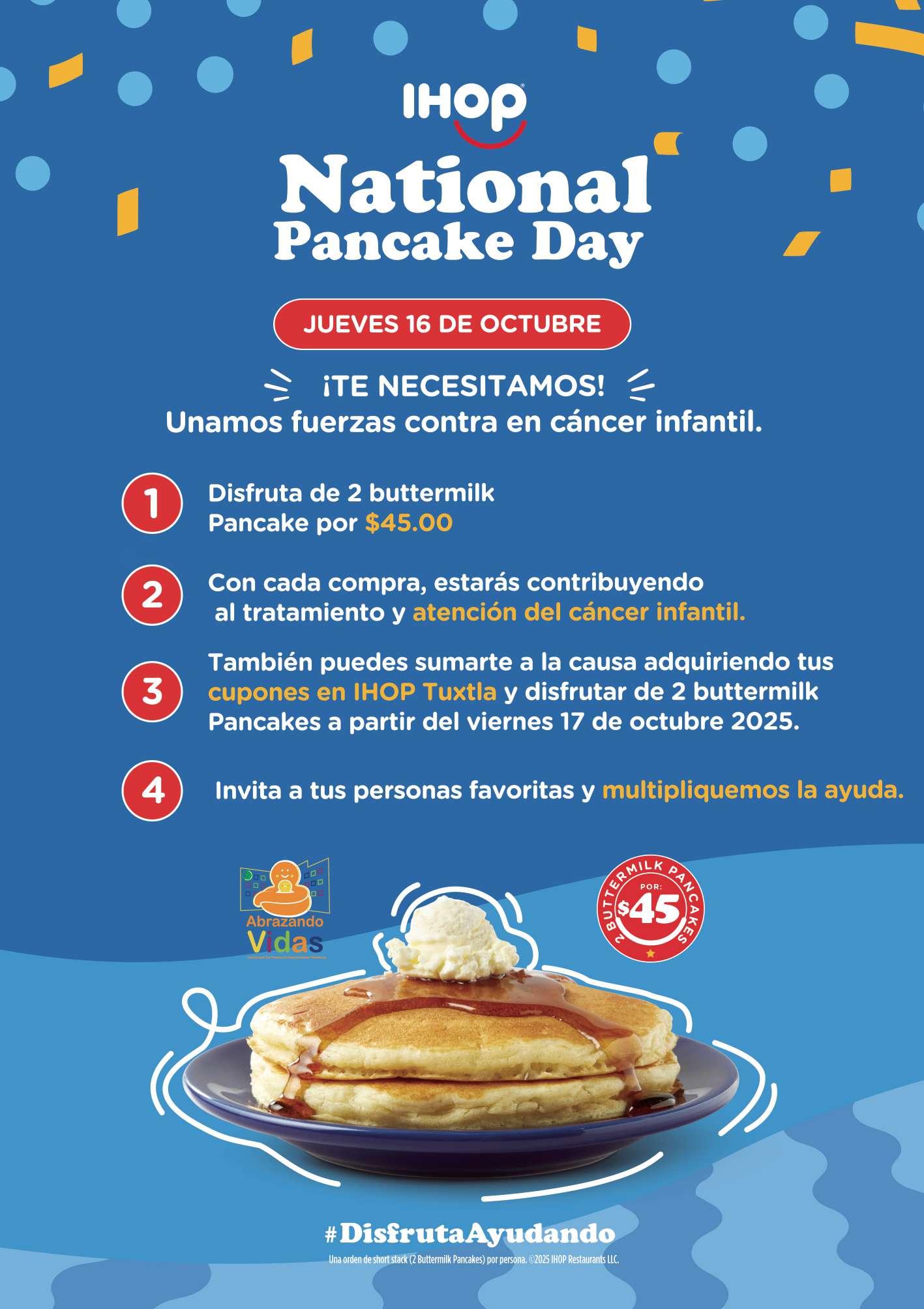 Este jueves 16 de octubre, IHOP Tuxtla invita a toda la comunidad a sumarse a una causa que alimenta el alma tanto como el corazón. Como parte de su ya tradicional National Pancake Day, el restaurante ofrecerá dos clásicos Buttermilk Pancakes a un precio especial de $45.00 MXN, y lo más importante: el 100% de lo recaudado será donado al Voluntariado del Hospital de Especialidades Pediátricas de Tuxtla Gutiérrez, “Abrazando Vidas”.