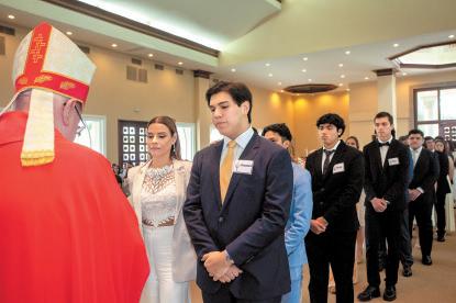 El umbral del templo La Sagrada Familia de la Fundación MHOTIVO recibió en su altar a los alumnos de undécimo grado de la Escuela Internacional Sampedrana, EIS, quienes, acompañados de sus padrinos, realizaron el sacramento de la confirmación. Los 84 jóvenes completaron durante varios meses el curso de preparación, dirigido por la catequista Marla Panayotti y su equipo. La ceremonia fue presidida por monseñor Michael Lenihan, quien los exhortó a fortalecer su fe y llevar una vida basada en los principios cristianos.