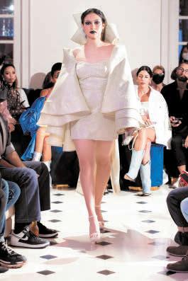 enamoró con sus prendas de delicados lazos y detalles girly teñidos de rosa. La pausa de María Steffania fue únicamente en el runway, porque en su taller había mucho por crear y aprender, “la pandemia cambió el rubro. Con la manufacturación de mascarillas aprendimos a hacer producción en masa mientras confeccionábamos a la par vestidos de noche. Creamos una submarca llamada Ninfa, que es más accesible que la línea a la medida. También retomamos el tema de los zapatos que nuestros clientes aman”, explica la diseñadora, graduada en Parsons The New School for Design de Nueva York.