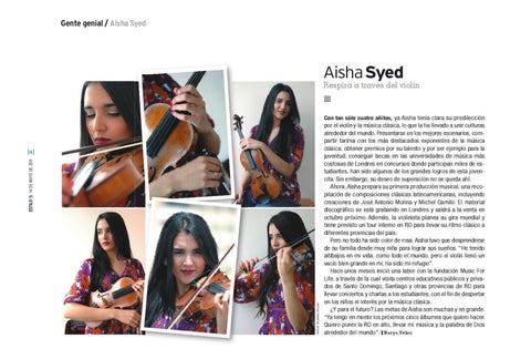 por el violín y la música clásica, lo que la ha llevado a unir culturas alrededor del mundo. Presentarse en los mejores escenarios, compartir tarima con los más destacados exponentes de la música clásica, obtener premios por su talento y por ser ejemplo para la juventud, conseguir becas en las universidades de música más costosas de Londres en concursos donde participan miles de estudiantes, han sido algunos de los grandes logros de esta jovencita. Sin embargo, su deseo de superación no se queda ahí. Ahora, Aisha prepara su primera producción musical, una recopilación de composiciones clásicas latinoamericanas, incluyendo creaciones de José Antonio Molina y Michel Camilo. El material discográfico se está grabando en Londres y saldrá a la venta en octubre próximo. Además, la violinista planea su gira mundial y tiene previsto un tour interno en RD para llevar su ritmo clásico a diferentes provincias del país. Pero no todo ha sido color de rosa. Aisha tuvo que desprenderse de su familia desde muy niña para lograr sus sueños. “He tenido altibajos en mi vida, como todo el mundo, pero el violín llenó un vacío bien grande en mí, ha sido mi refugio”. Hace unos meses inició una labor con la fundación Music For Life, a través de la cual visita centros educativos públicos y privados de Santo Domingo, Santiago y otras provincias de RD para llevar conciertos y charlas a los estudiantes, con el fin de despertar en los niños el interés por la música clásica. ¿Y para el futuro? Las metas de Aisha son muchas y en grande. “Ya tengo en mente los próximos cinco álbumes que quiero hacer. Quiero poner la RD en alto, llevar mi música y la palabra de Dios alrededor del mundo”. y Norys Vélez