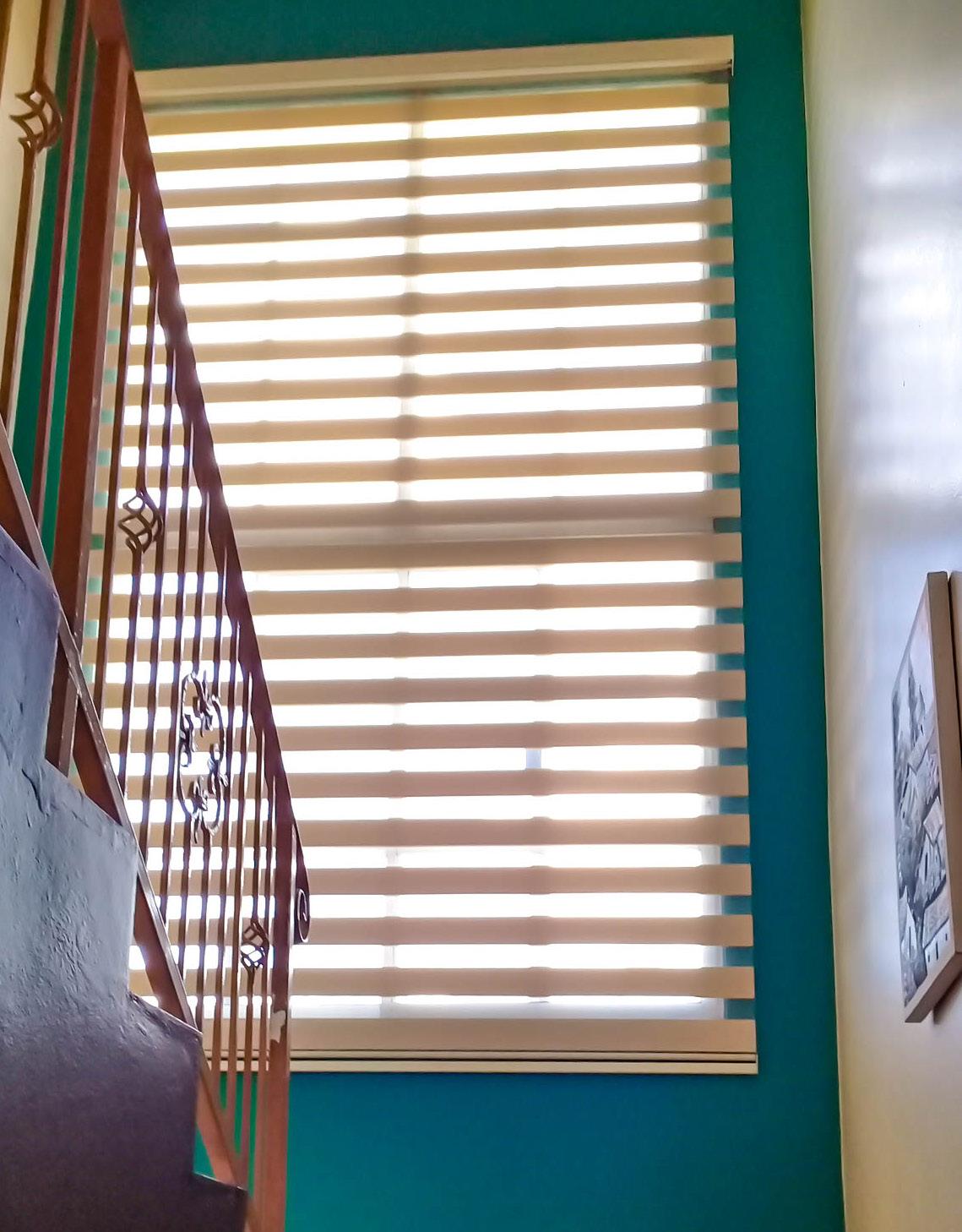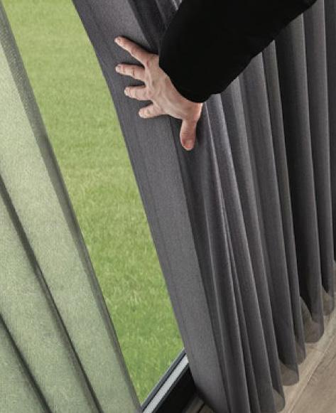 Constan de lienzos de tela verticales individuales con franjas sólidas y transparentes que te permiten controlar la luz y privacidad. Perfectas para grandes ventanales y puertas corredizas, ya que puedes caminar a través de la cortina, incluso cuando está cerrada.