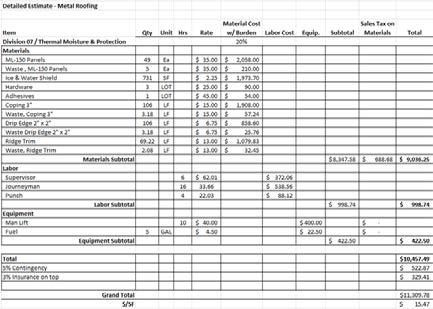 Every project presents unique and complex challenges – even when building a prototype. For this reason, it is important to understand each of the factors that go into producing a takeoff and ultimately the cost estimate. This paper is intended to guide the reader to evaluate a complete takeoff for sheet metal roofing on a sample project and to produce one. Here, I will explain in detail what those considerations are and how they play a major role in how to estimate the cost of sheet metal roofing. We’ll refer to the Construction Specifications Institute MasterFormat Division 07 for Thermal and Moisture Protection [and not Division 05 – Metals]. Division 07 contains roofing materials, assemblies, and performance standards; whereas, Division 05 contains structural steel and miscellaneous metal information.