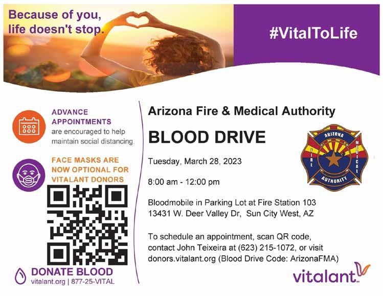 EMERGENCY SERVICES Emergencies (Police/Fire/Medical) 911 Maricopa County Sheriff’s Office 602.876.1000 Fire Department Non-Emergency 623.584.3500 Poison Control Center 800.222.1222 HOSPITAL Banner Del Webb 623.524.4000 MARICOPA COUNTY Animal Care & Control 602.506.7387 Arizona Game & Fish (Coyotes) 602.942.3000 Residential Permits 602.506.3301 Sun City Library 602.652.3000 POST OFFICES Sun City West Post Office 623.546.3990 Surprise Post Office 623.544.4672 LICENSES MVD - ADOT 602.255.0072 Vehicle Emissions Station 887.692.9227