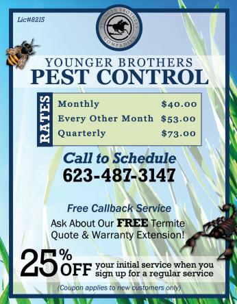 22 Estrella Publishing - Main Street magazine December 2022 Your local Verrado advisors Johnson David Johnson, Wealth Advisor Sani Fuimaono, Wealth Advisor Securities and Advisory Services Offered Through Prospera Financial Services | Member FINRA, SIPC jwealth.co 866.575.7020 Can’t wait to enjoy the fall weather outside? Let us help you get those bugs under control. Call Larry, to schedule your appointment today! 623-680-6619 www.estrellamtnpest.com Your full service Pest and Termite control company. Ask for your new customer discount! Quality Pest and Termite Control Check out “The Bug Guy” article in your neighborhood Magazine!