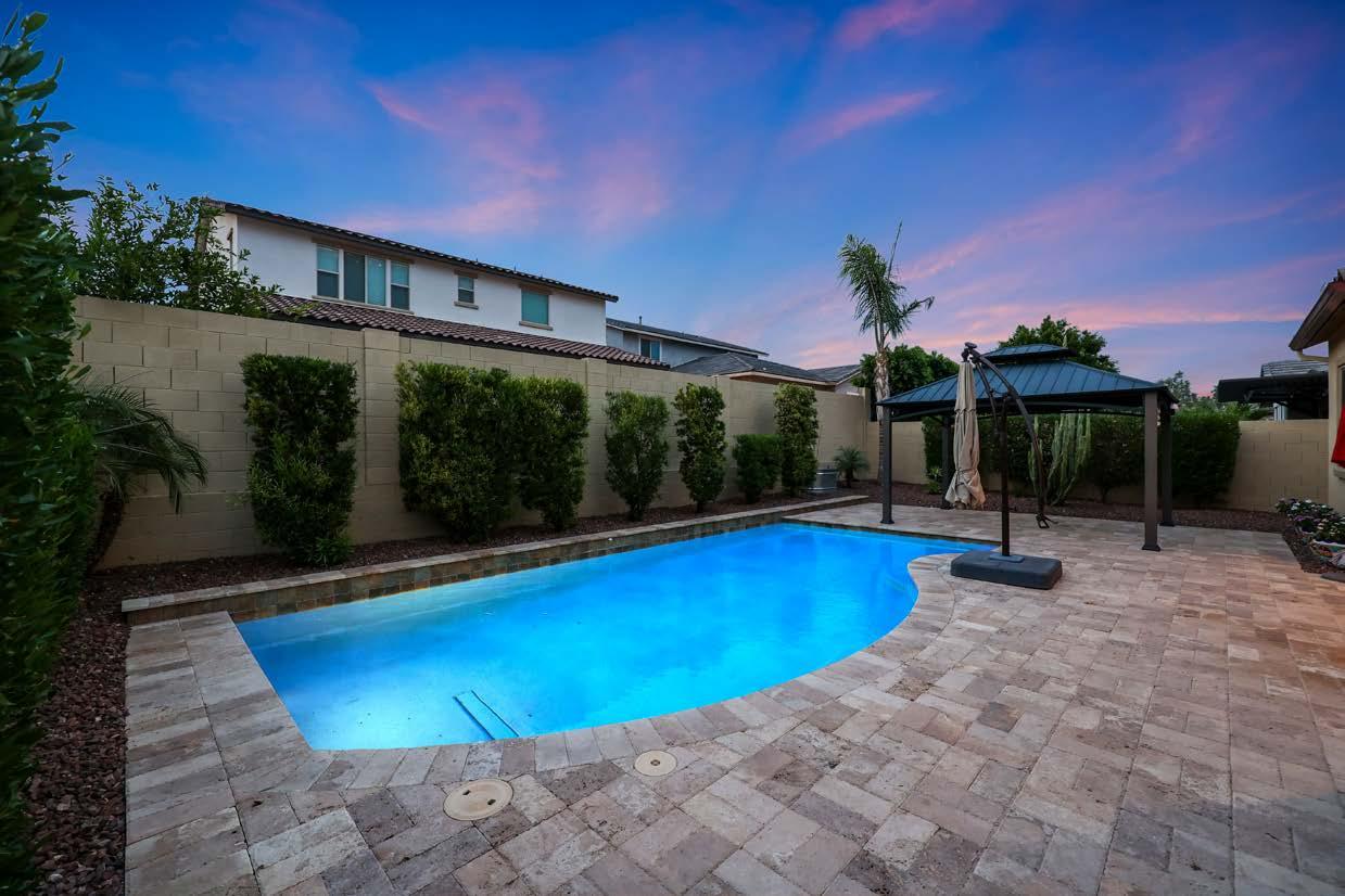 is close to Heritage swim park as well as the local elementary/middle school. This single story pool home features 3 bedrooms, 2 bathrooms plus a separate den with over 2200 sq feet and a 3 car garage. Enjoy the immaculate kitchen complete with a gas stove, an oversized island and stainless steel appliances. The primary bedroom is split from the other rooms and features a large bathroom that connects to the laundry room. Relax in your well appointed, low maintenance backyard perfect for entertaining with a large pergola and play pool. Come live the Verrado lifestyle.