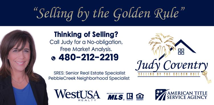 310.702.1055 480.316.0016 623.853.5878 480.797.1111 623.271.0518 480.212.2219 623.377.1329 “Experience a Higher Standard of Service” PEBBLECREEK RESIDENT REALTORS® SUE BURKHARDT 623.853.5878 | BurkhardtTeam@gmail.com JESSICA BURKHARDT 623.695.7776 | jbb.azrealty@gmail.com Dominick Santalucia Branch Manager - Team Leader NMLS ID 204938 (602) 524-2421 (623) 321-5816 dominicks@fairwaymc.com www.SantaluciaTeam.com Download the FAIRWAYNOW app to apply now FIMC NMLS #2289 AZ License #BK-0904162 20359 N. 59th Ave., Suite 100 | Glendale, AZ 85308 VIEW ALL PEBBLECREEK LISTINGS AT www.BURKHARDTTEAM.com TODAY! FEATURED LISTING $625,000 1801 N. 165th Drive 2 Bed + Den & 2 Bath | 1,968 sqft. WARM, INVITING & MOVE-IN READY! Expanded Fiesta floor plan with open great room living. Located on one of the largest common area lots in PebbleCreek. Ample space to add a custom casita & pool.