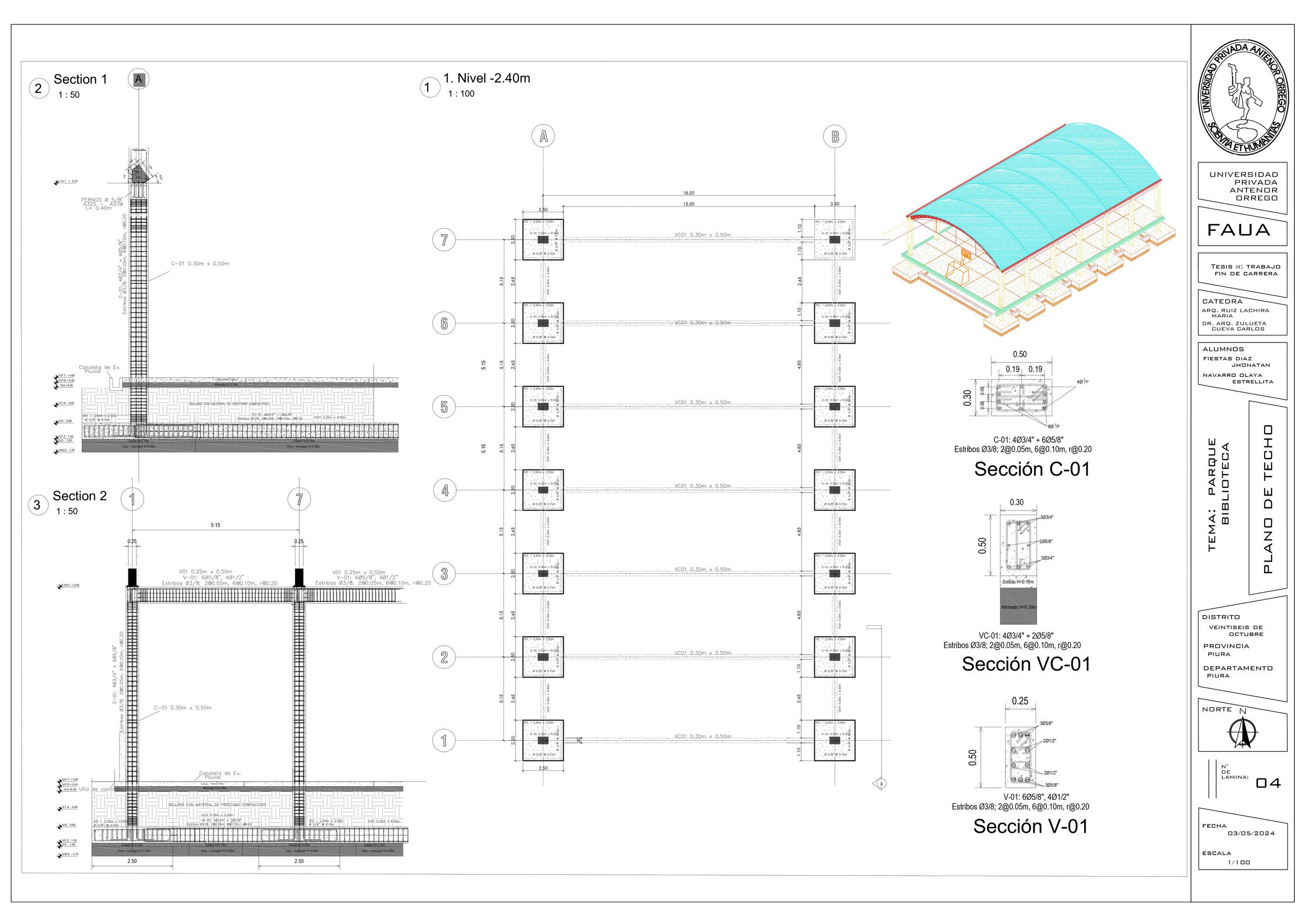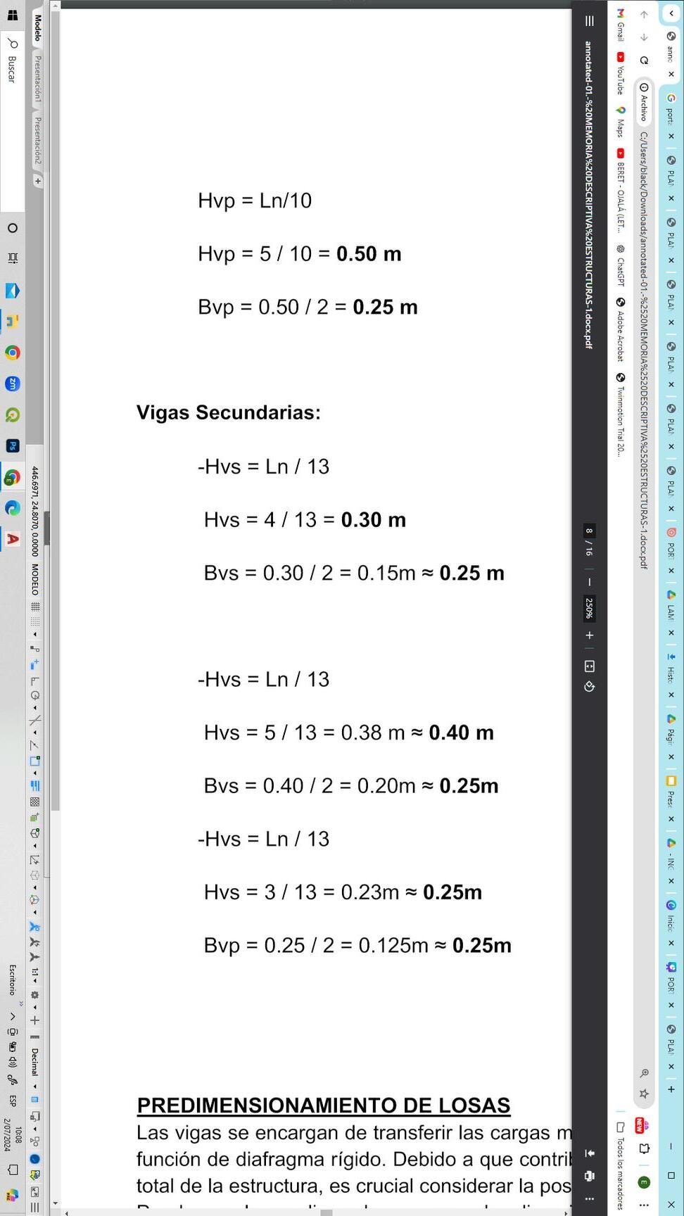 Existen criterios prácticos para determinar el peralte de vigas, que dan buenos resultados, con cargas vivas no excesivas. Las vigas son elementos sometidos a flexión, el peralte deberá estar entonces en función de la longitud y la carga. La norma de diseño E-060 nos da unos requisitos que debe cumplir la sección, para asegurar el buen comportamiento estructural de una viga sismoresistente, así como también para controlar la deflexión. Al someterlos a la teoría se procederá al cálculo de peralte L/10 o L12, siendo L=luz libre de la viga, y la base B = 0.3 H @ 0.5 H y como mínimo de ancho 35 cm. En sistemas sismorresistentes, además la norma E-060 recomienda un peralte mínimo de L/16. Por lo tanto, podemos dar como un avance que los elementos estructurales de la estructura cumplen estos requisitos, de esta forma se predimensionan todas las demás vigas.