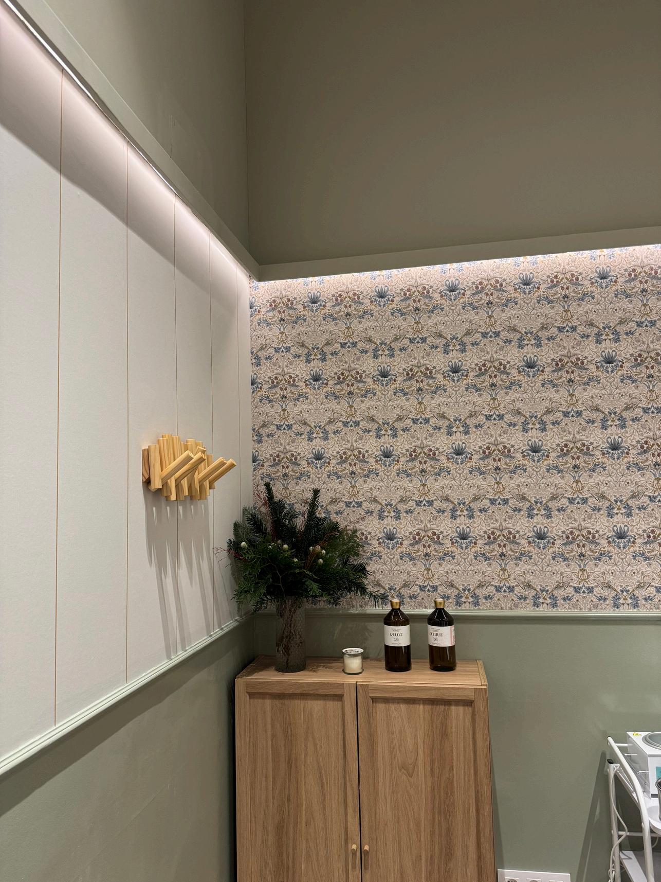Acabados con personalidad: Colocación experta de papeles pintados y revestimientos decorativos que definen el estilo del local.