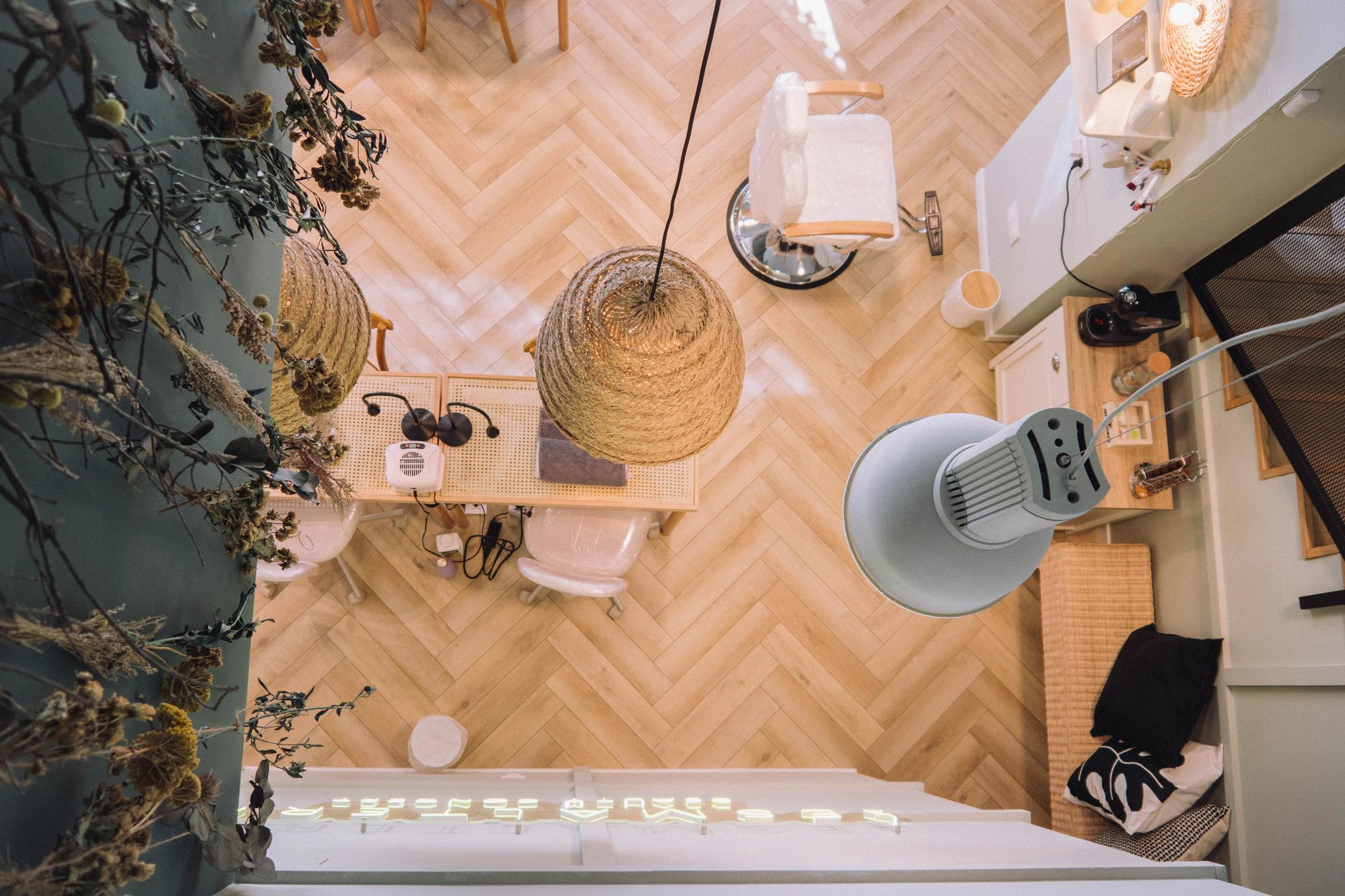 Atmósfera de diseño: Instalación de luminarias de autor y acabados premium, como el suelo de madera natural.