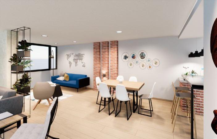 El objetivo es abrirlacocinae integrarla al comedor para generar un co-rrelación de funciones.Eleje articulador es un barra tipo bar, que le permita al usuario el uso diario de este espacio sin necesitar el comedor.