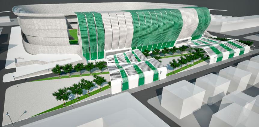 Conceptualmente se interpreta esta intervención como el renacimiento del espacio público a partir de la fachada del estadio del Betis, es por esto que se plantean dos franjas que nacen del nivel 0.00 y se vinculan a la fachada virtualmente por medio de la utilización del mismo patrón, donde las dilataciones corresponden a franjas verdes que permiten luz y sombra en los grandes espacios cubiertos.