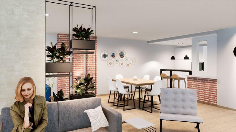 Espacio diáfano, delimitado virtualment e por 3 verticales en ladrillo que marcan jerarquíaen el gran muro blanco de fondo.