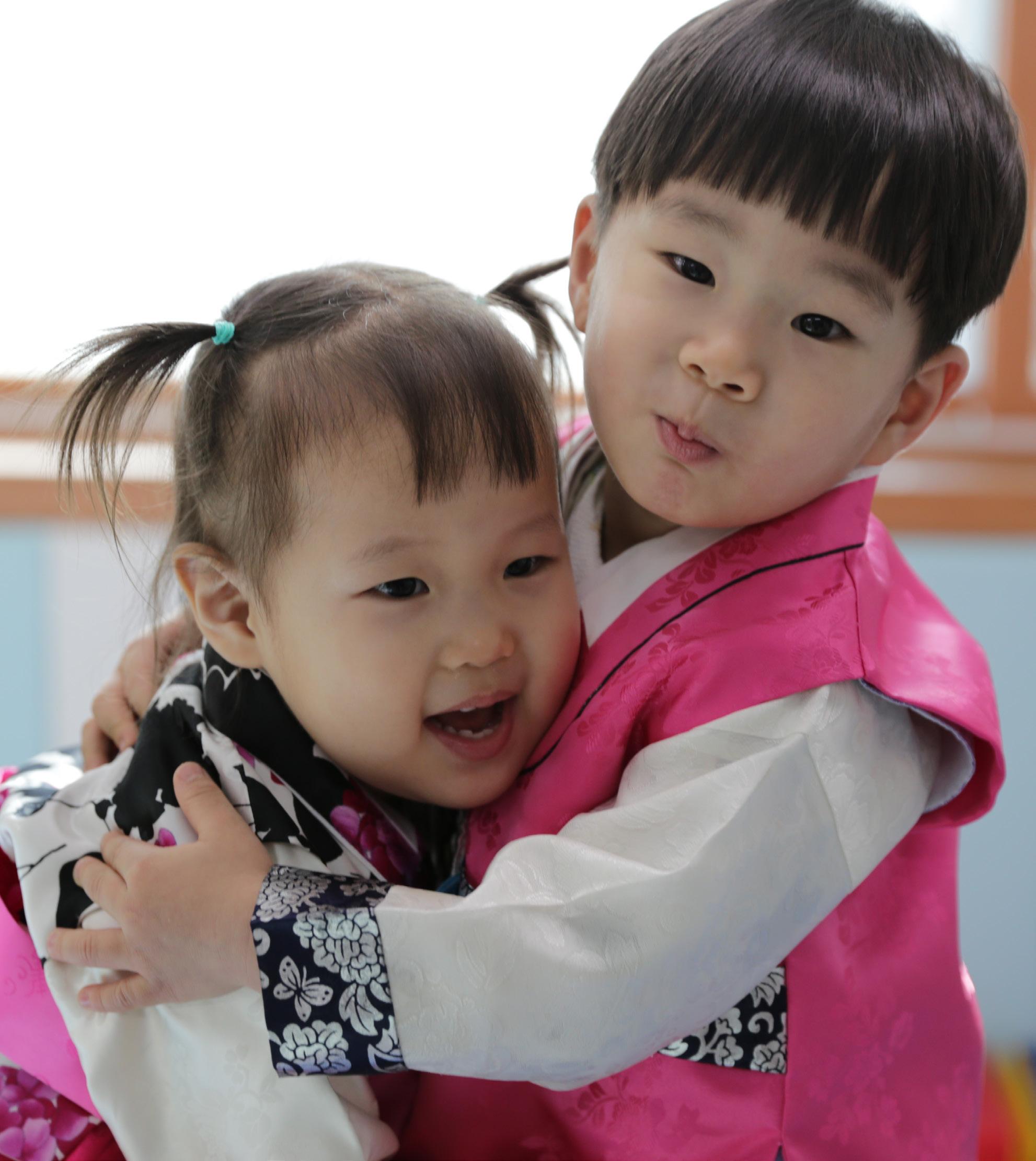 한복을 입고 설날 세배 연습을 하다가 서로 장난을 치고있는 모습입니다.