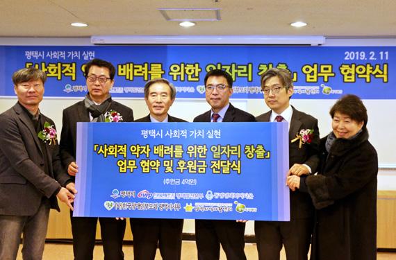 부 및 평택시, 평택복지재단 등 6개의 상호 협력 기관 인사들을 초대하여 업무 협약식을 실시하였다. 이번 협약식은 사회적 약자 배려를 위한 일자리 창출을 목적으로 평택서부발전본부의 지원을 받아, 장애인 세차장 2개와 카페를 개소하여 사회적 약자 가 지속적으로 경제활동할 수 있는 일자리를 창출할 계획이다. 차별없는 고용과, 공공기관과의 상생협력