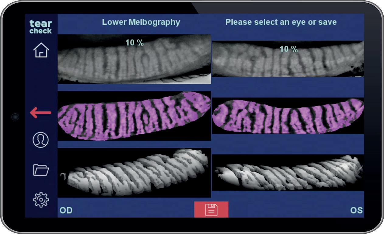 Makes it possible to visualize the Meibomian glands in 2D imaging and 3D rendering. The results help to evaluate the rate of gland loss (in %) and the morphology of the glands present.