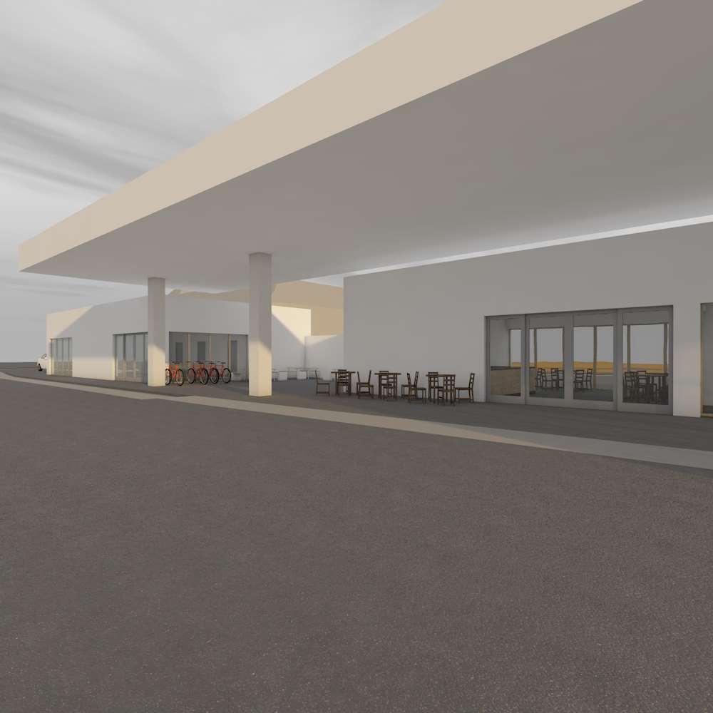 Anövekvőbenzinárakéskörnyezetbarátéletmódelőretörésemiattegyre többenkezdtekelbiciklizniavárosban.Akerékpárutakkialakításaazutóbbi évekbenfelgyorsult,amitahozzátartozóinfrastruktúraazigényekhezképest csakjóvallassabbantudottkövetni.Atervezésifeladatcéljaegy,akerékpárosok igényeireszabott,kiszolgálásukatellátó,megállóhelyésszervízpontlétesítésevolt ajelenlegitetőszerkezetmegtartásával.Abenzinkúthoztartozószervizutat lezártamaforgalomelől.Azígykialakulttérremektalálkozóhelyévéválhata környékenélőkszámára.Akétépülettömegközöttiudvartakörnyezőházak belsőudvaroskialakításaihlette.Abüféfogyasztóterénkeresztülátlátniazút túloldalánelterülőparkra.