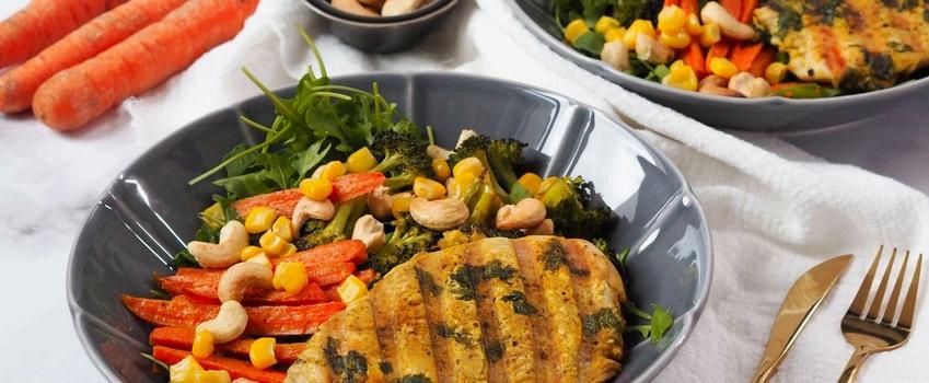6. ZAČNĚTE PŘIPRAVOVAT SALÁT NA TALÍŘI. DO KAŽDÉHO TALÍŘE DEJTE 1 HRST RUKOLY A 1 HRST KUKUŘICE. PŘIDEJTE UPEČENOU ZELENINU, UGRILOVANÉ MASO A KEŠU OŘÍŠKY.