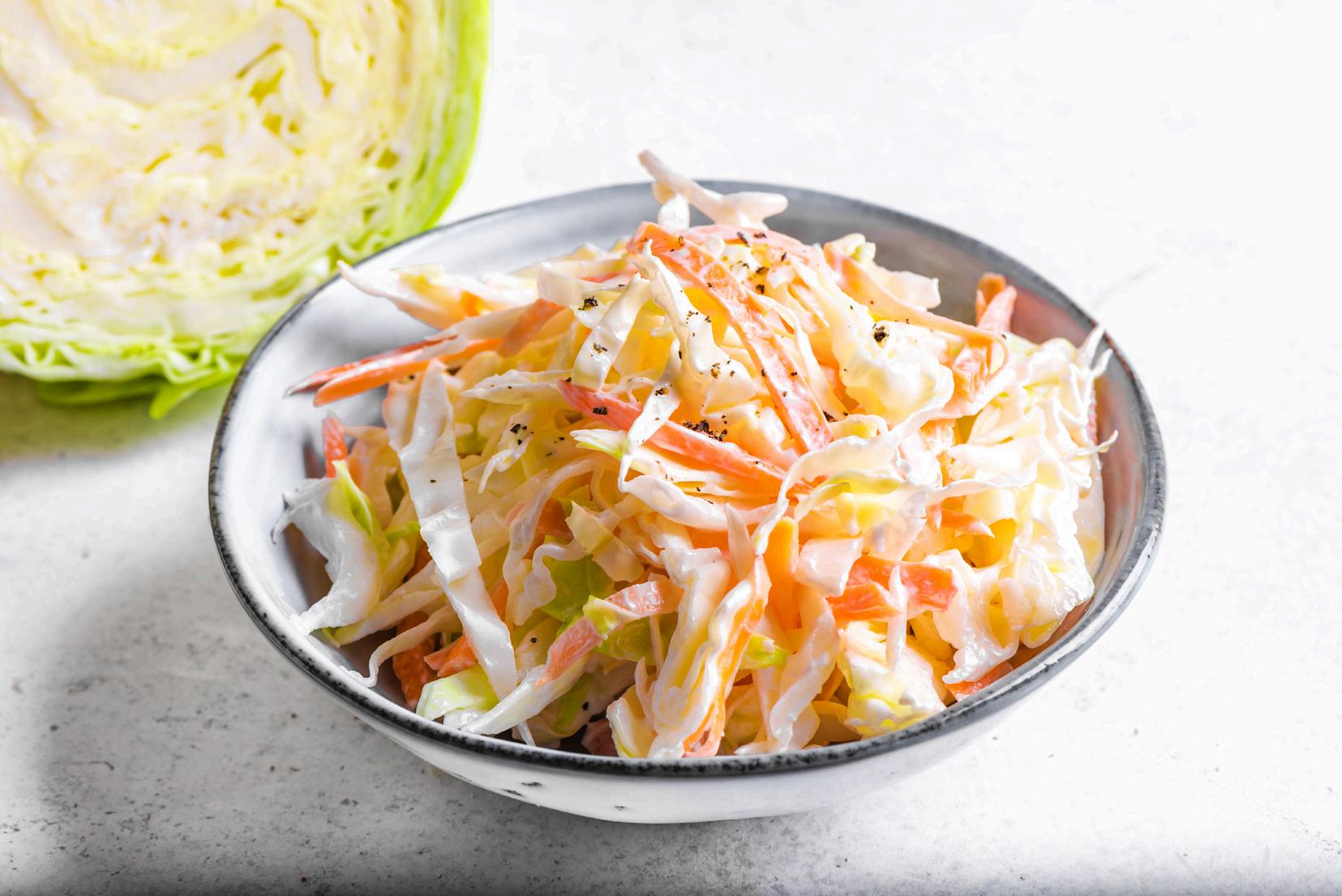 Křehký, osvěžující salát, jehož hlavní surovinou je zelí, doplněné mrkví a celerem. Tato vitaminová bomba také pozitivně působí na biochemickou rovnováhu mozku. Podávat ho můžete například s kuřecími paličkami smaženými na másle, jen tak s bylinkami nebo s karbanátky.