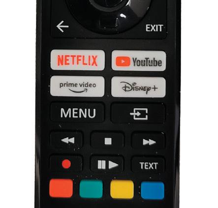 Obvyklým příslušenstvím přijímače je dálkový ovladač ve standardním provedení, které známe už z předchozích modelů této značky. S televizorem ovladač komunikuje i po Bluetooth, na úvod instalace je proto třeba obě zařízení spárovat, což je díky nákresu, který se zobrazí, zcela snadné (současné přidržení dvou tlačítek). Jednotka je poměrně velká a obsahuje jak sekci numerických tlačítek, tak kolébkové ovladače zvuku a vzestupné/sestupné volby televizních stanic, nechybějí ani tlačítka pro vypnutí zvuku, ovládání reprodukce multimediálních souborů, či klasická barevná „teletextová“ tlačítka, dnes využívaná hlavně pro hybridní vysílání HbbTV. Centrální část zaujímá klasický kruhový čtyřsměrný ovladač pro pohyb v nabídkách, v rozích doplněný o voliče programového průvodce, vstupu do menu a tlačítka Zpět a Exit. Nechybí ani volba zabudovaného mikrofonu, který lze využít pro hlasové vyhledávání. To funguje bezproblémově i v češtině, výsledky se ale rekrutují pouze z obsahu portálu YouTube. Ze streamovacích služeb mají na ovladači svá přímá tlačítka Netflix, YouTube, Prime Video a Disney+.