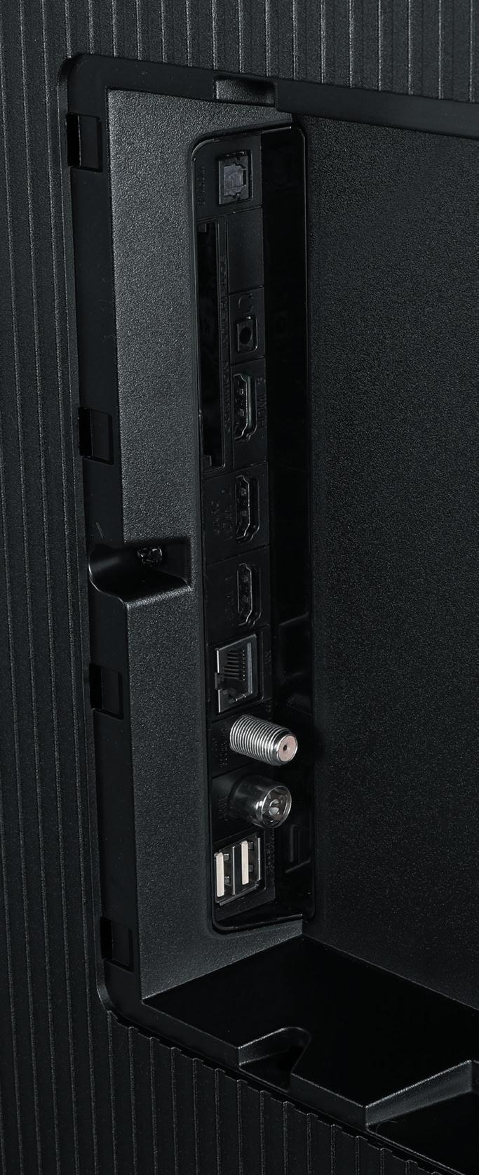 Povrch obrazovky můžeme označit za polomatný, takže reflexy světelných zdrojů z okolí na jeho ploše jsou poměrně omezené. Pro běžnou instalaci na stole, skříňce a podobném nábytku slouží pár noh s poměrně snadnou montáží (jistí je po dvou šroubech), pro umístění na zeď obvyklé závity systému VESA na zadní straně (400 × 200 mm). Rozteč noh má ale jen jednu variantu, vzdálenost je cca jeden metr, což klade jisté rozměrové nároky na nábytek, na který lze televizor postavit (dvě polohy nabízí až větší, 65" model). Všechny konektory jsou umístěny v hluboké boční „kapse“ na levé straně zádi (z pohledu diváka). Jejich sestava obsahuje trojici vstupů HDMI (2.1), dva porty USB (2.0), optický digitální zvukový výstup, LAN pro kabel domácí počítačové sítě a nechybí ani minijack pro kabelová sluchátka, což, myslím, nejeden uživatel ocení, tím spíše, že tento výstup je už často opomíjen. To ovšem nebrání možnosti použít i sluchátka bezdrátová. Komplet doplňují anténní přípojky (po jedné pro pozemní/kabelový a satelitní příjem) a čtečka dekodérů Common Interface pro placené programy (kabel, satelit). Všechny přípojky (s výjimkou napájení ze sítě) jsou vedeny rovnoběžně s plochou obrazovky, takže ani při nástěnné instalaci televizoru by s vedením kabelů neměl nastat problém. Prostor konektorů lze také zakrytovat, aby de facto splynul s desénem zadní strany.