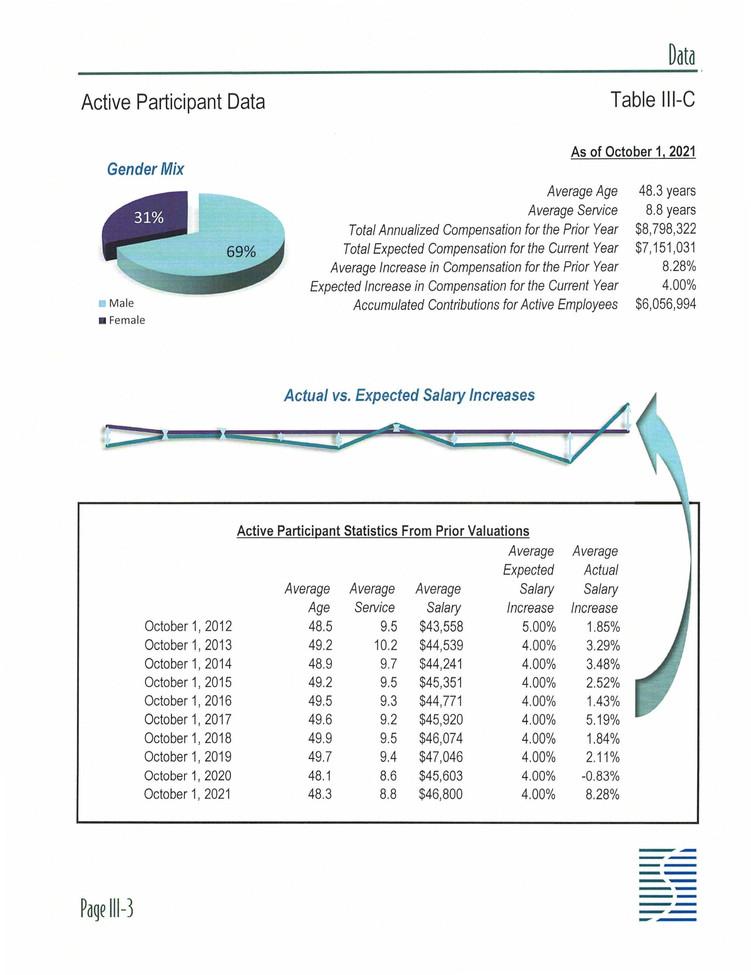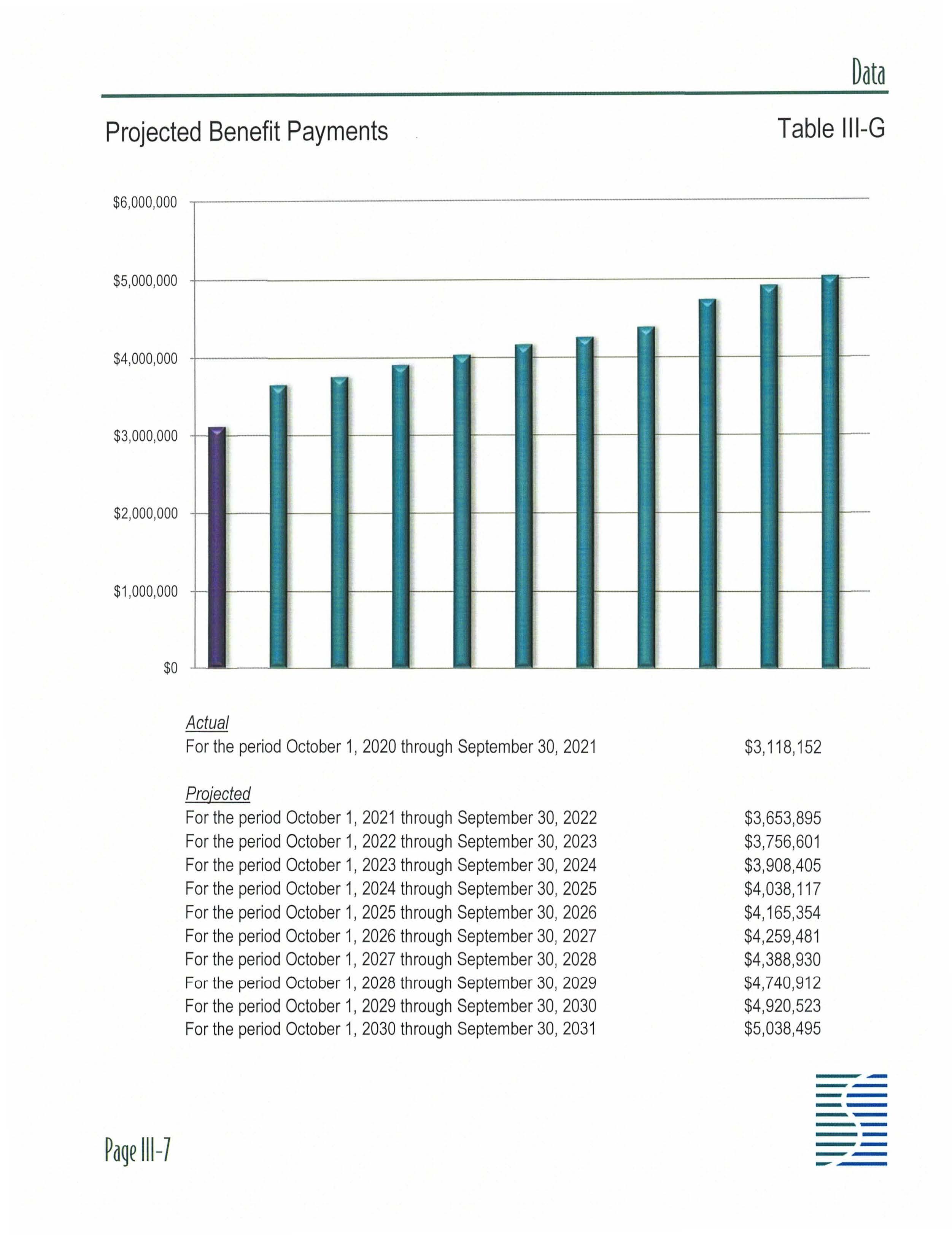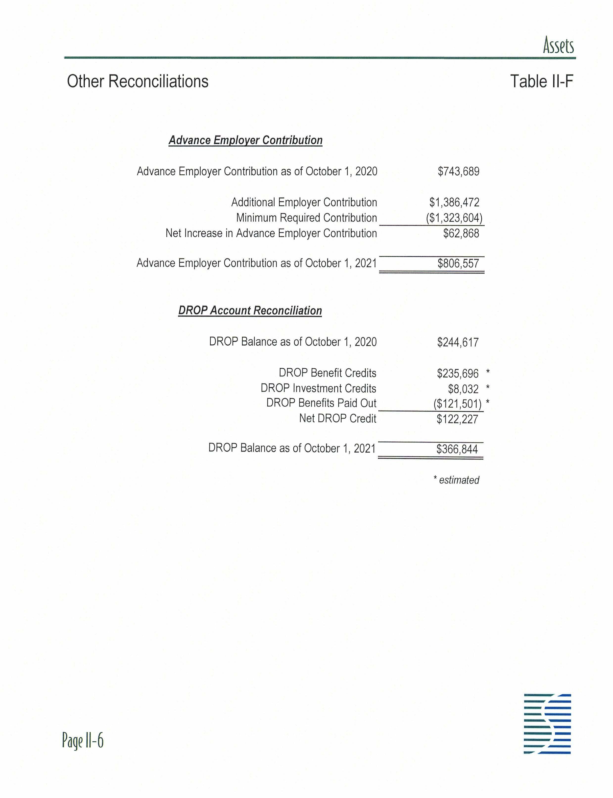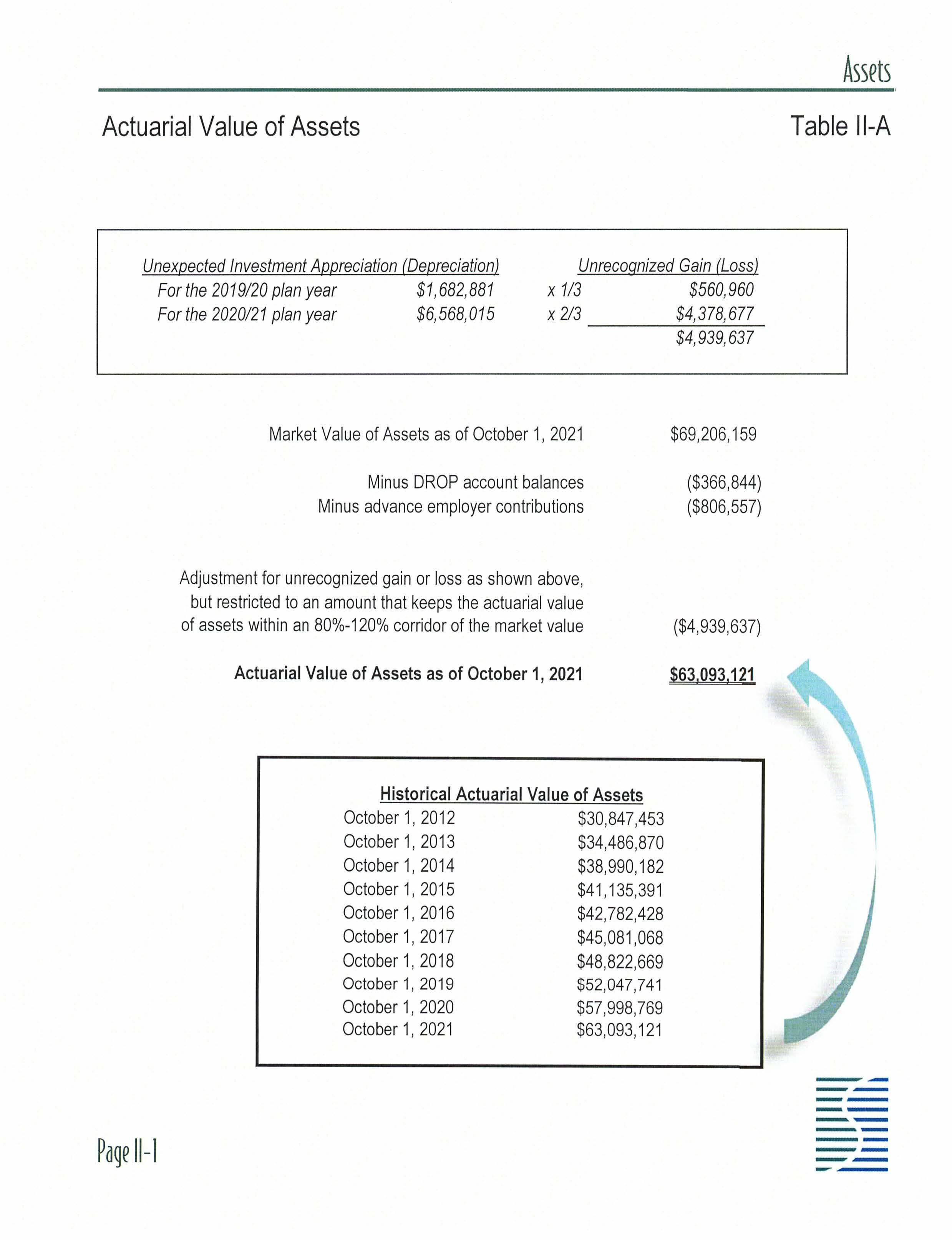 Tables I-D through I-H provide a detailed breakdown of various liability amounts by type of benefit and by participant group. Tables II-A through II-F provide information concerning the assets of the trust fund. Specifically, Table II-A shows the development of the actuarial value of assets, which is based on a three-year phase-in of the net investment appreciation in order to provide a more stable and predictable contribution rate for the employer Tables Ill-A through III-G provide statistical information concerning the plan 's participant population In particular, Table III-G gives a 10-year projection of the cash that is expected to be required from the trust fund in order to pay benefits to the current group of participants Finally, Tables IV-A through V-B provide a summary of the actuarial assumptions and methods that are used to value the plan 's benefits and of the relevant plan provisions as of October 1, 2021 , as well as a summary of the changes that have occurred since the previous valuation report was prepared