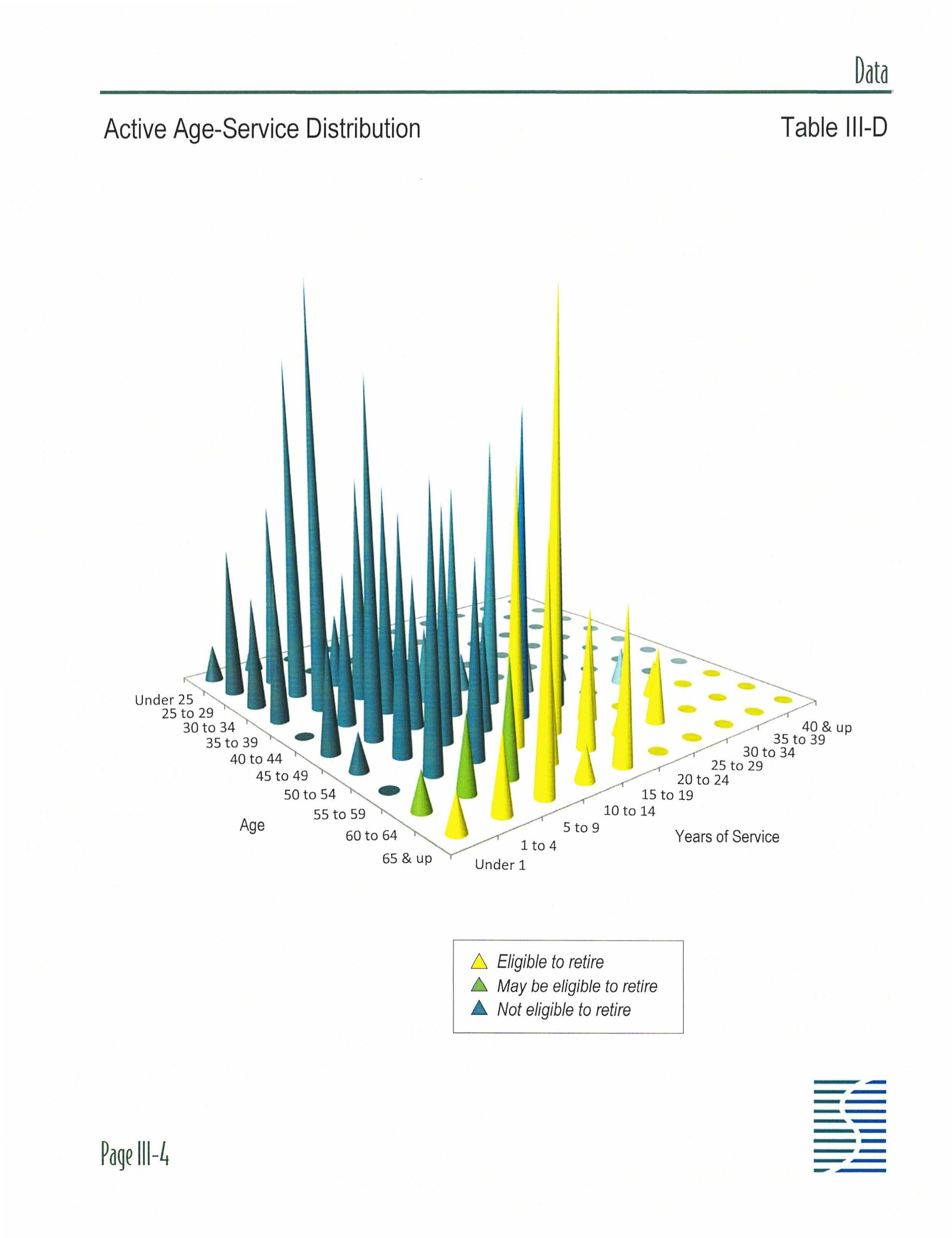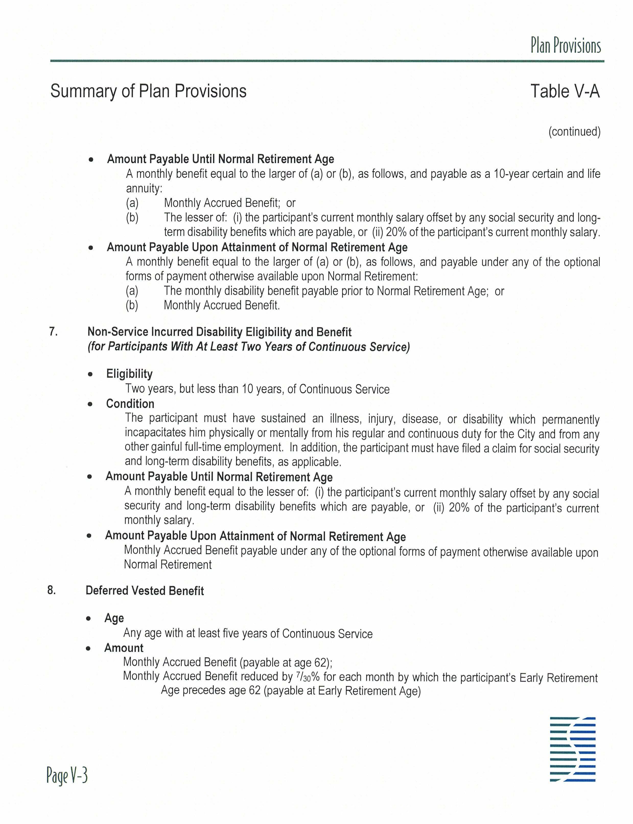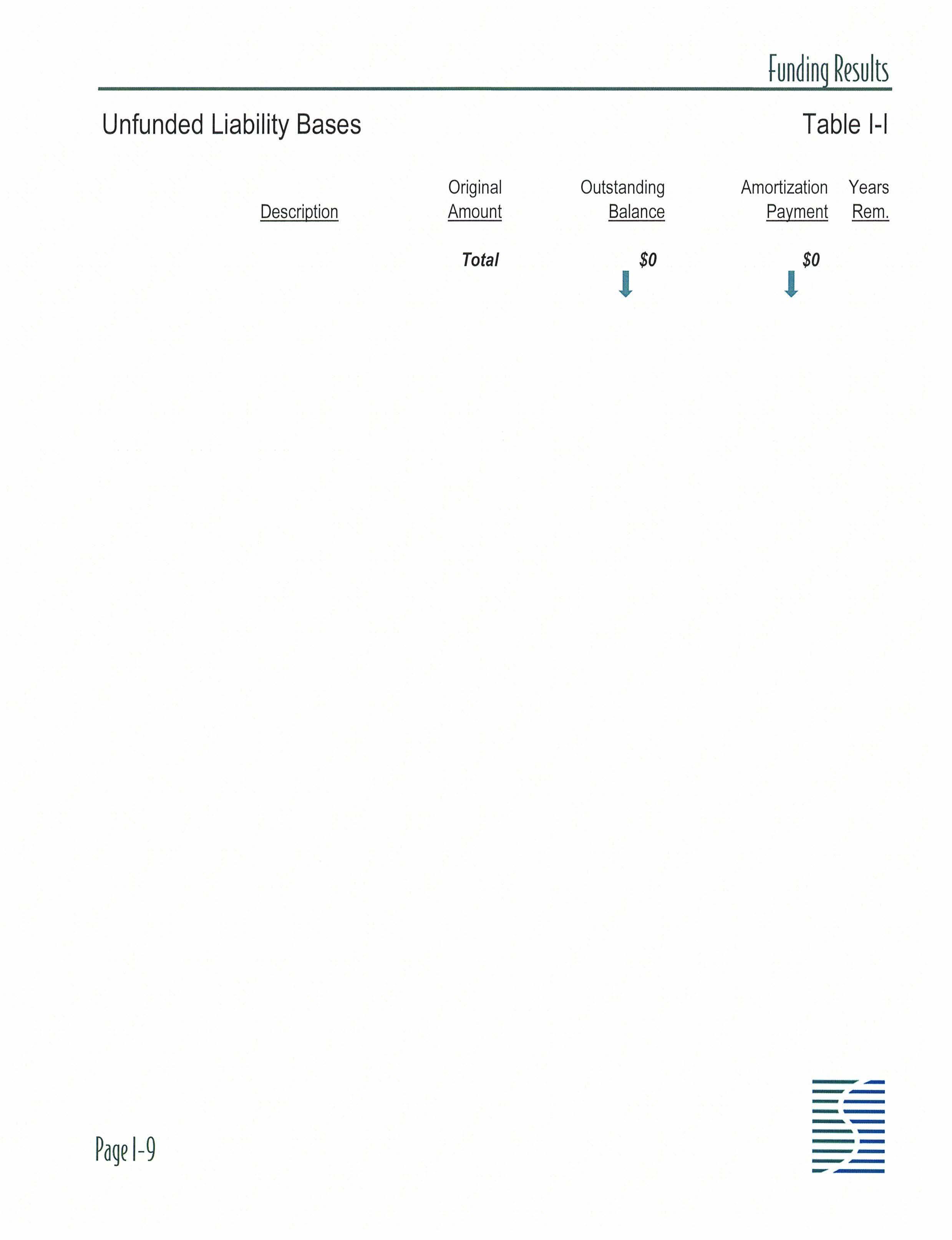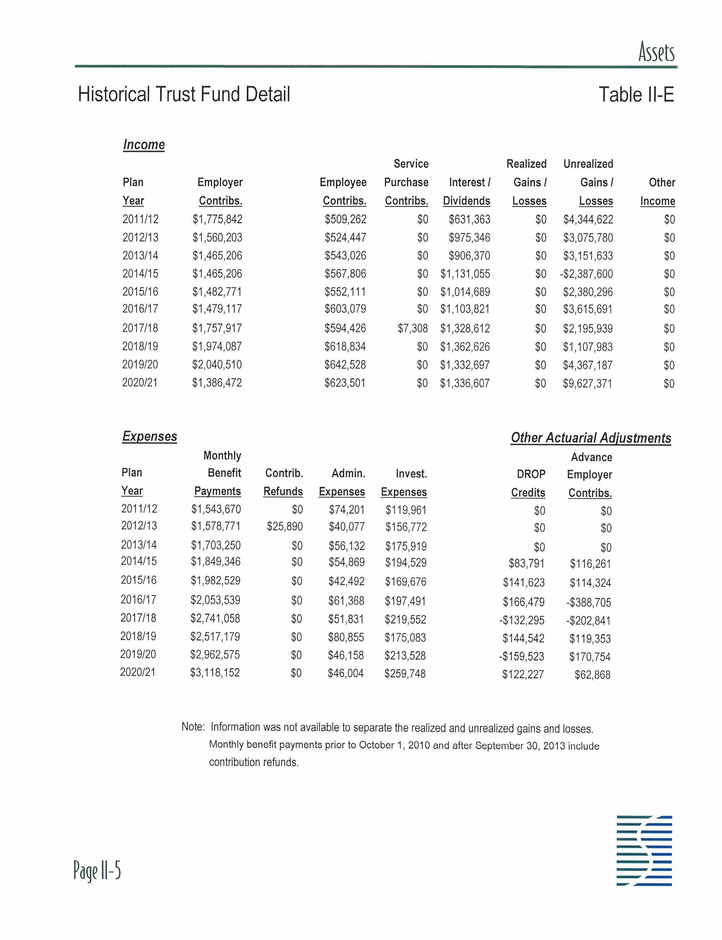 Tables I-D through I-H provide a detailed breakdown of various liability amounts by type of benefit and by participant group. Tables II-A through II-F provide information concerning the assets of the trust fund. Specifically, Table II-A shows the development of the actuarial value of assets, which is based on a three-year phase-in of the net investment appreciation in order to provide a more stable and predictable contribution rate for the employer Tables Ill-A through III-G provide statistical information concerning the plan 's participant population In particular, Table III-G gives a 10-year projection of the cash that is expected to be required from the trust fund in order to pay benefits to the current group of participants Finally, Tables IV-A through V-B provide a summary of the actuarial assumptions and methods that are used to value the plan 's benefits and of the relevant plan provisions as of October 1, 2021 , as well as a summary of the changes that have occurred since the previous valuation report was prepared
