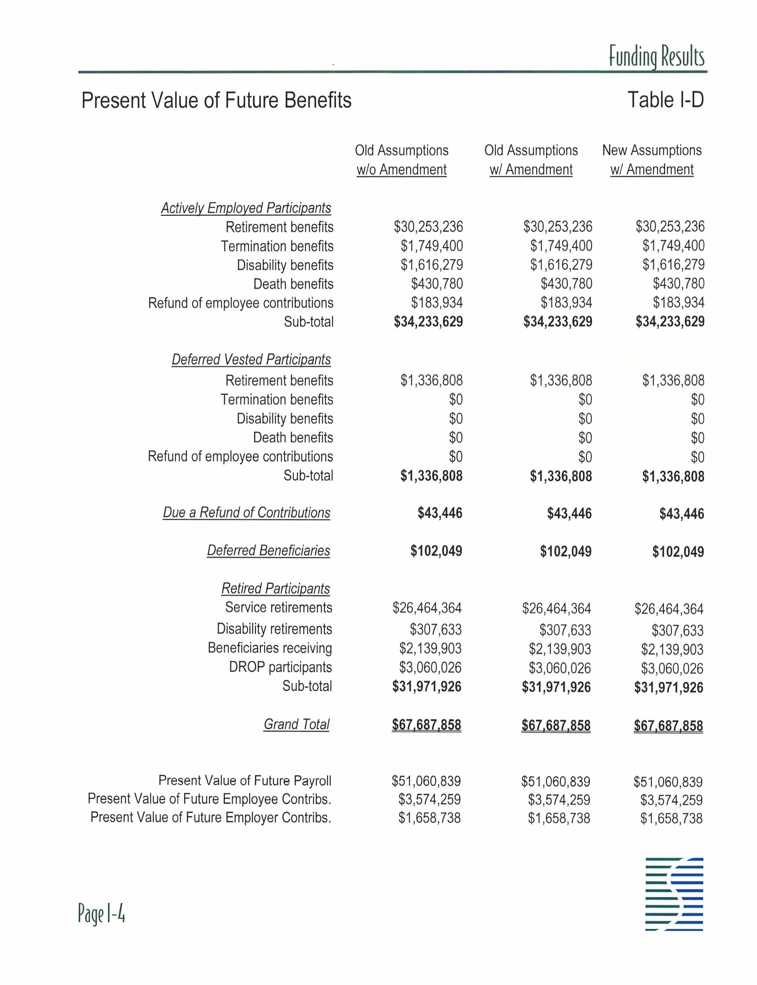 Based on the current assets , participant data, and actuarial assumptions and methods that are used to value the plan , the present-day value of the total long-term funding requirement is $68 ,326 ,118. As illustrated in Table I-A, current assets are sufficient to cover $63,093 ,121 of this amount, the employer's 2021 /22 expected contribution will cover $1 ,066 ,518 of this amount, and future employee contributions are expected to cover $3 ,574 ,259 of th is amount, leaving $592 ,220 to be covered by future employer funding beyond the 2021 /22 fiscal year Again, demographic and investment experience that differs from that assumed will either increase or decrease the future employer funding requirement.