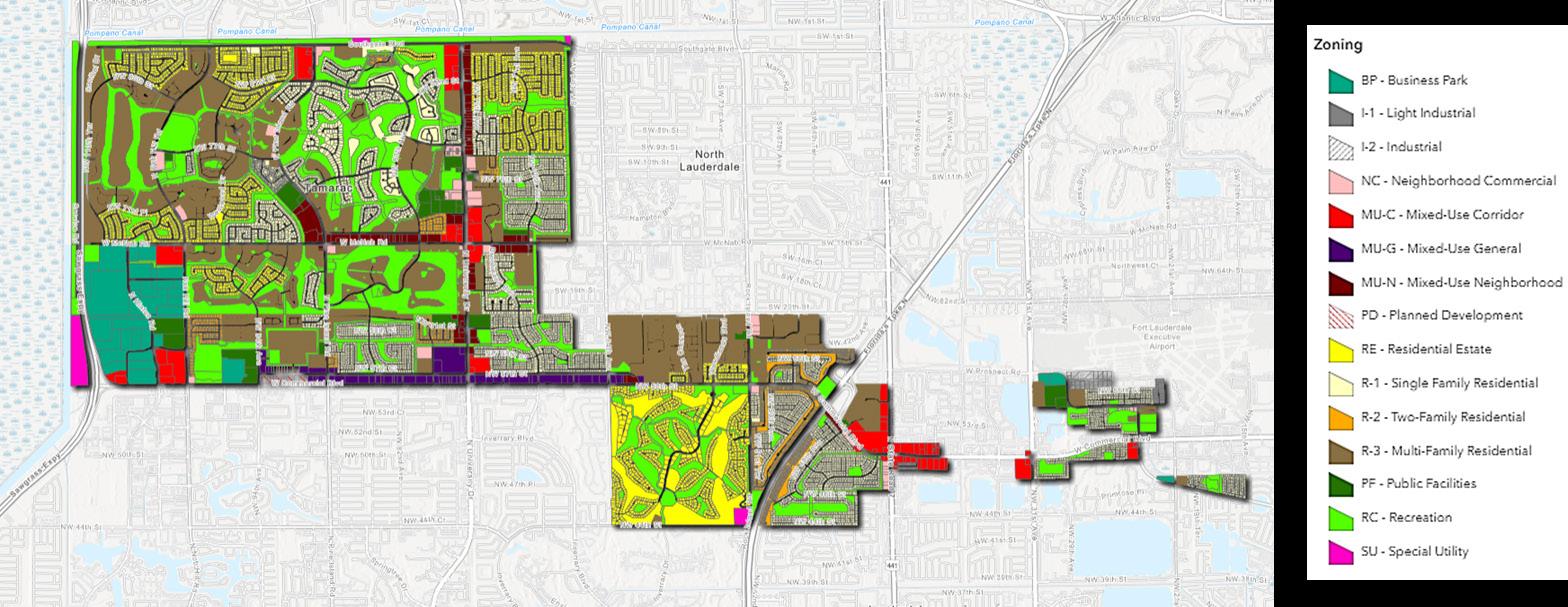 The Existing Zoning Map broadly categorizes Tamarac into areas with distinctly different types of development. In Tamarac, unlike in most cities, where development patterns vary based on proximity to the City center, development has occurred around major roadway intersections.
