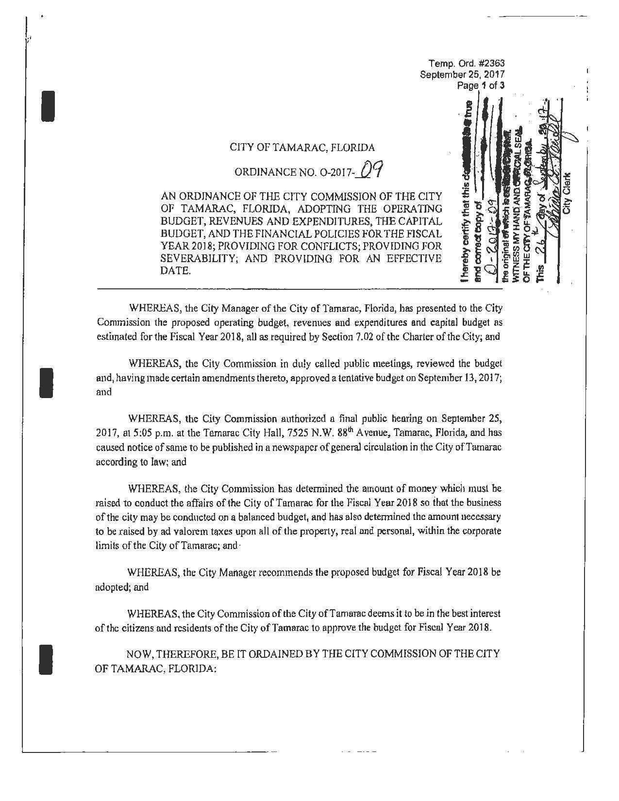 AN ORDINANCE OF THE CITY COMMISSION OF THE ClTY OP TAMARAC, FLORIDA, ADOPTING THE OPERATING BUDGET, REVENUES AND EXPENDITURES. THE CAPITAL BUDGET, AND THE FINANCIAL POLICIES FOR THE FISCAL YEAR 2018; PROVIDING FOR CONFLICTS; PROVIDING FOR SEVERABILITY; AND PROVIDING FOR AN EFFECTIVE DATE.
