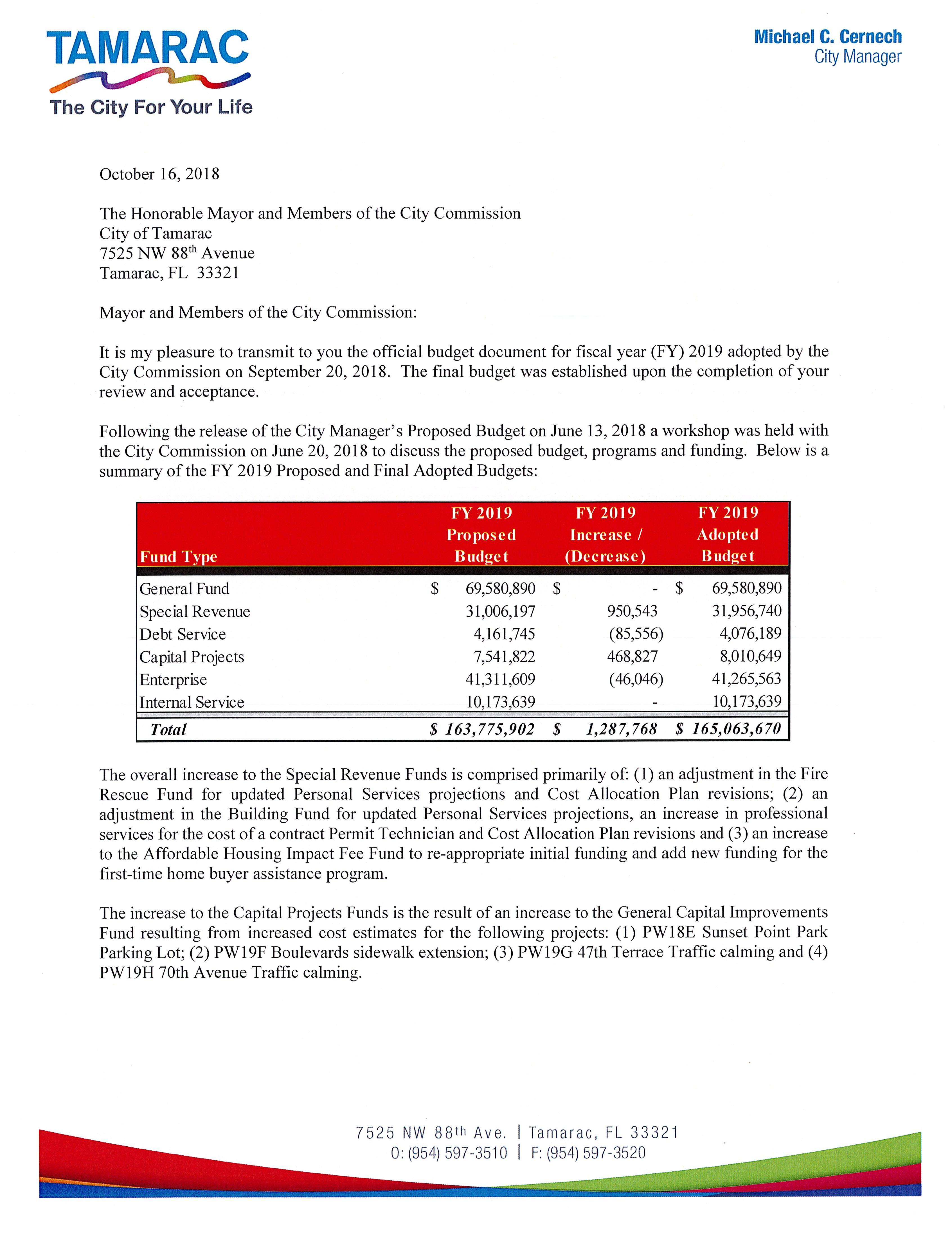 It is my privilege to submit to you for your consideration the City of Tamarac Proposed Budget for Fiscal Year 2019 (FY 2019) and the FY 2019 - FY 2024 Asset Management Program Budgets pursuant to the City’s Charter. As done previously, staff has developed a single year adoptable budget together with two projected years. This budget approach provides consistency year over year and includes two out years for forecasting purposes. This document also continues the inclusion of financial, operational and asset management plans as a part of the budget proposal.