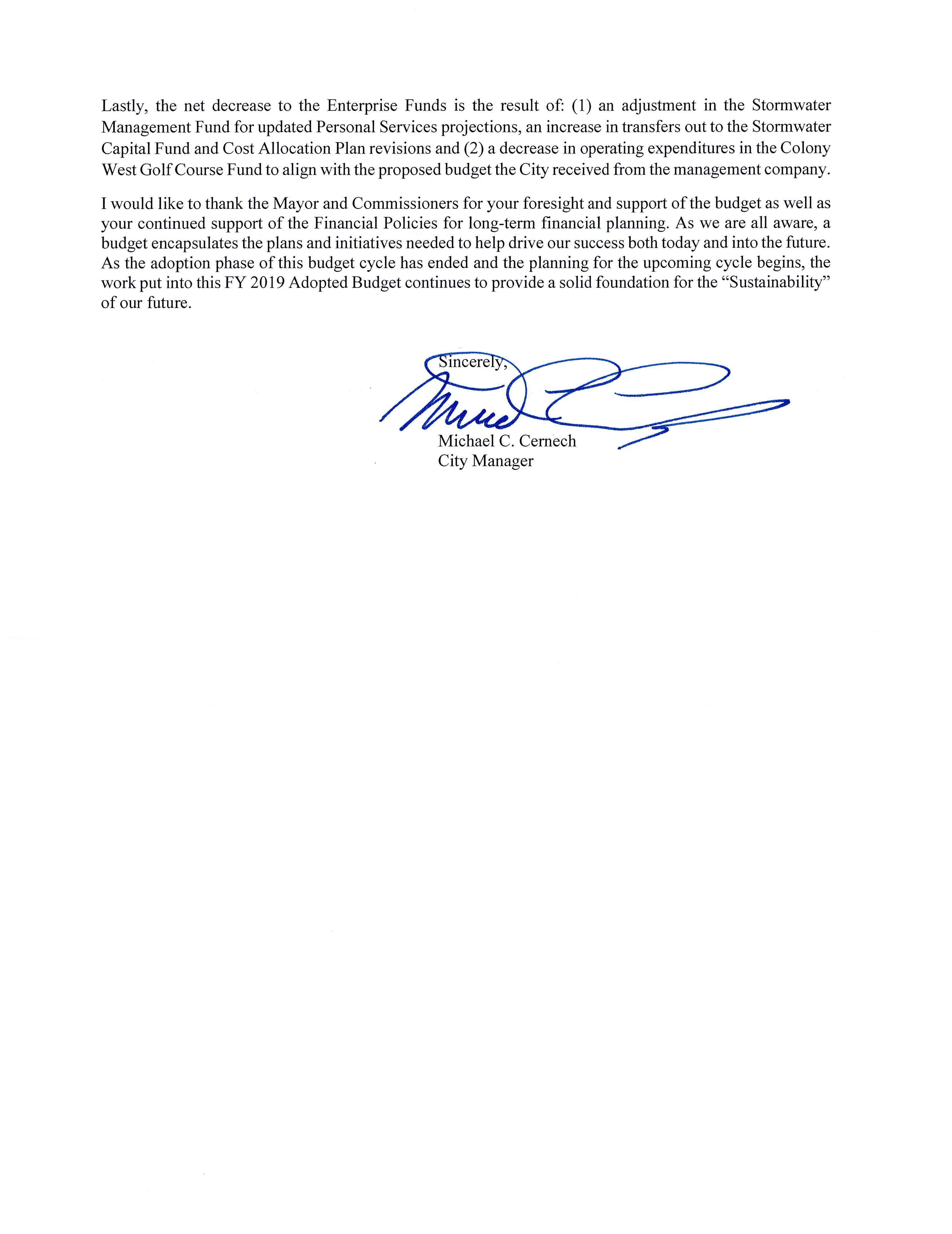 I would like to thank the Mayor and Commissioners for your foresight and support of the budget as well as your continued support of the Financial Policies for long-term financial planning. As we are all aware, a budget encapsulates the plans and initiatives needed to help drive our success both today and into the future. As the adoption phase of this budget cycle has ended and the planning for the upcoming cycle begins, the work put into this FY 2019 Adopted Budget continues to provide a solid foundation for the "Sustainability" of our future.