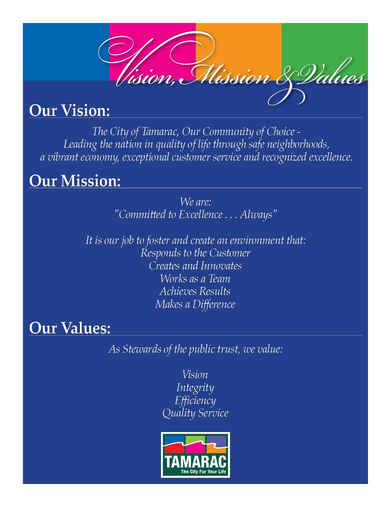 The City of Tamarac, Our Community of ChoiceLeading the nation in quality of life through safe neighborhoods, a vibrant economy, exceptional customer service and recognized excellence.