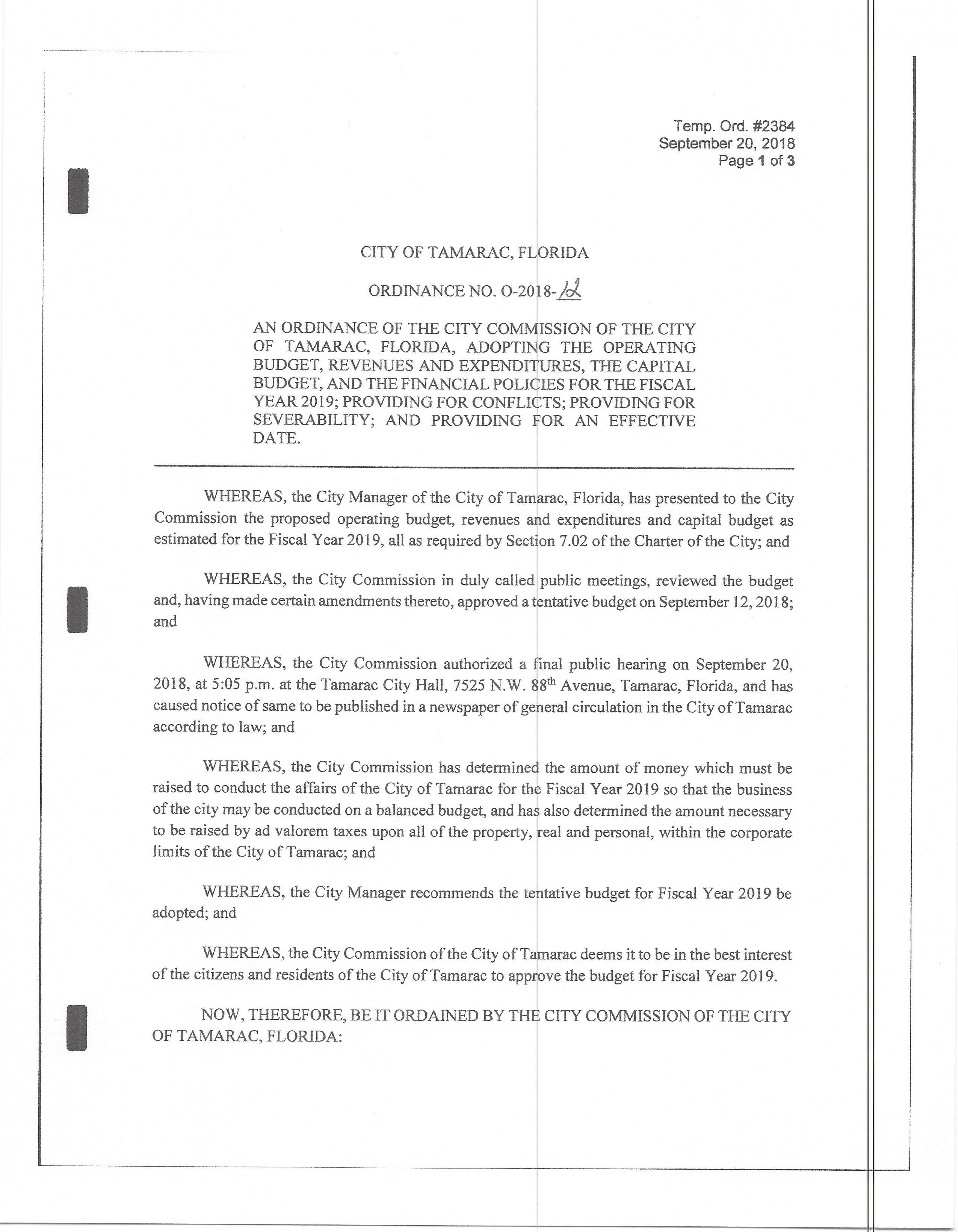 AN ORDINANCE OF THE CITY COMMISSION OF THE CITY OF TAMARAC, FLORIDA, ADOPTING THE OPERATING BUDGET, REVENUES AND EXPENDITURES, THE CAPITAL BUDGET, AND THE FINANCIAL POLICIES FOR THE FISCAL YEAR 2019; PROVIDING FOR CONFLICTS; PROVIDING FOR SEVERABILITY; AND PROVIDING fOR AN EFFECTIVE DATE.