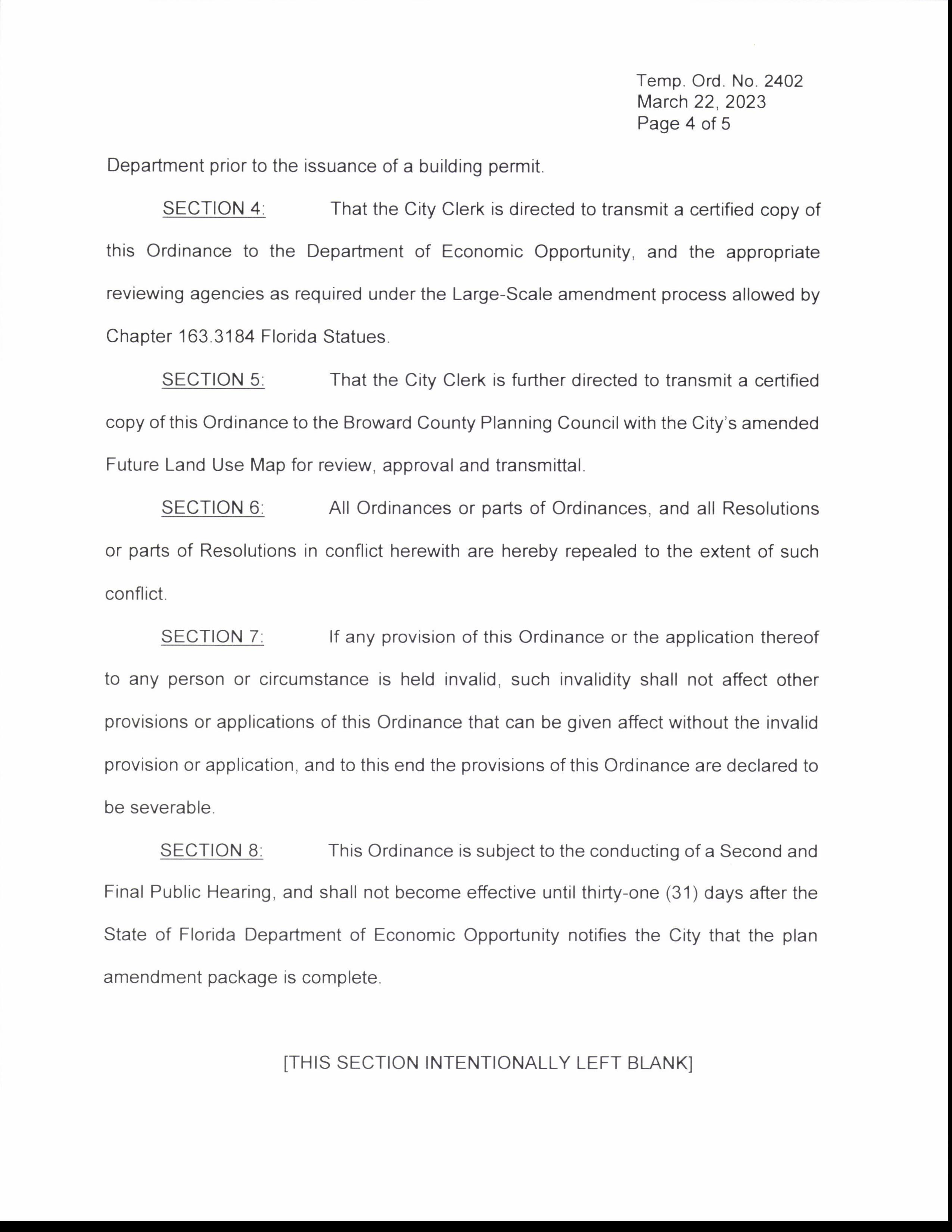 SECTION 8: This Ordinance is subject to the conducting of a Second and Final Public Hearing, and shall not become effective until thirty-one (31) days after the State of Florida Department of Economic Opportunity notifies the City that the plan amendment package is complete. THIS SECTION INTENTIONALLY LEFT BLANK]