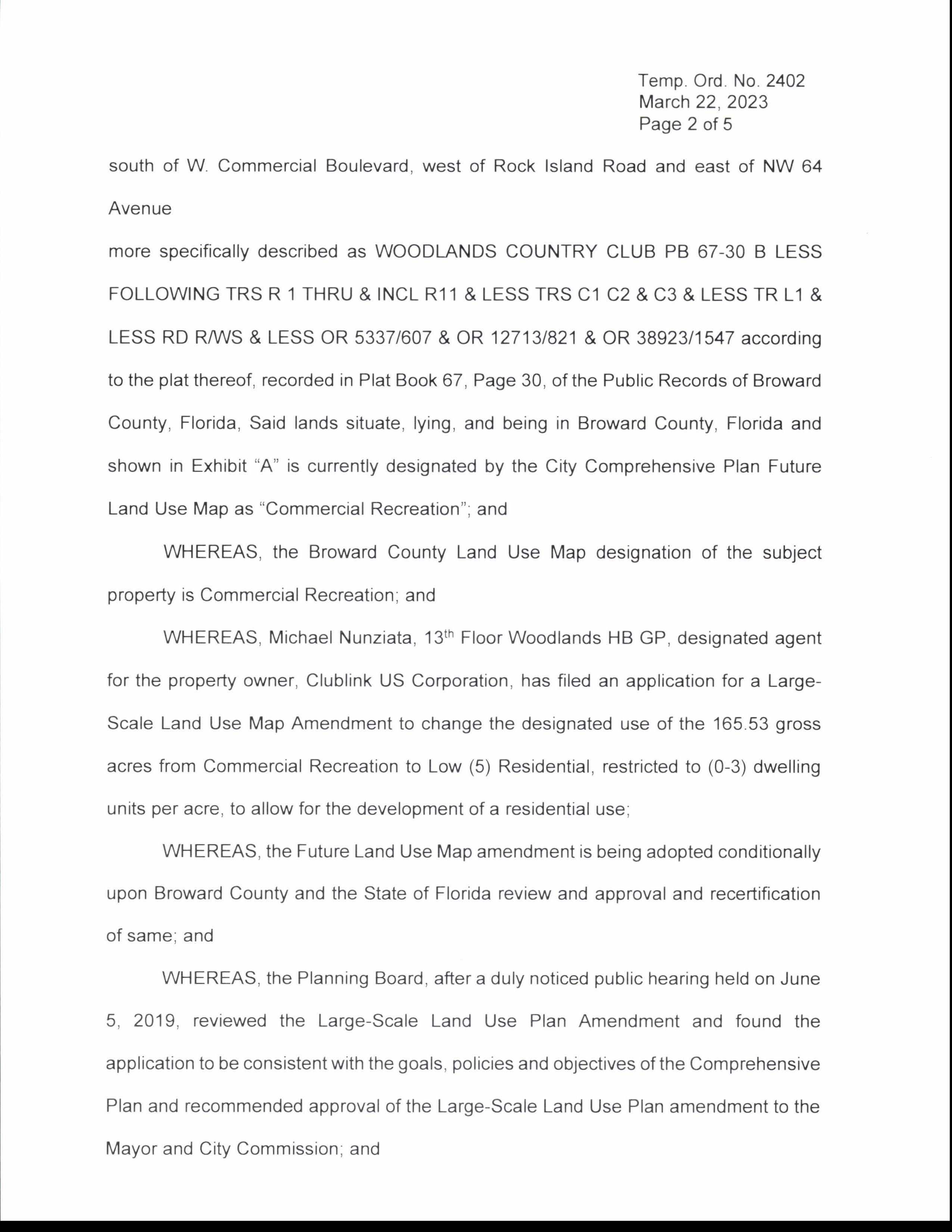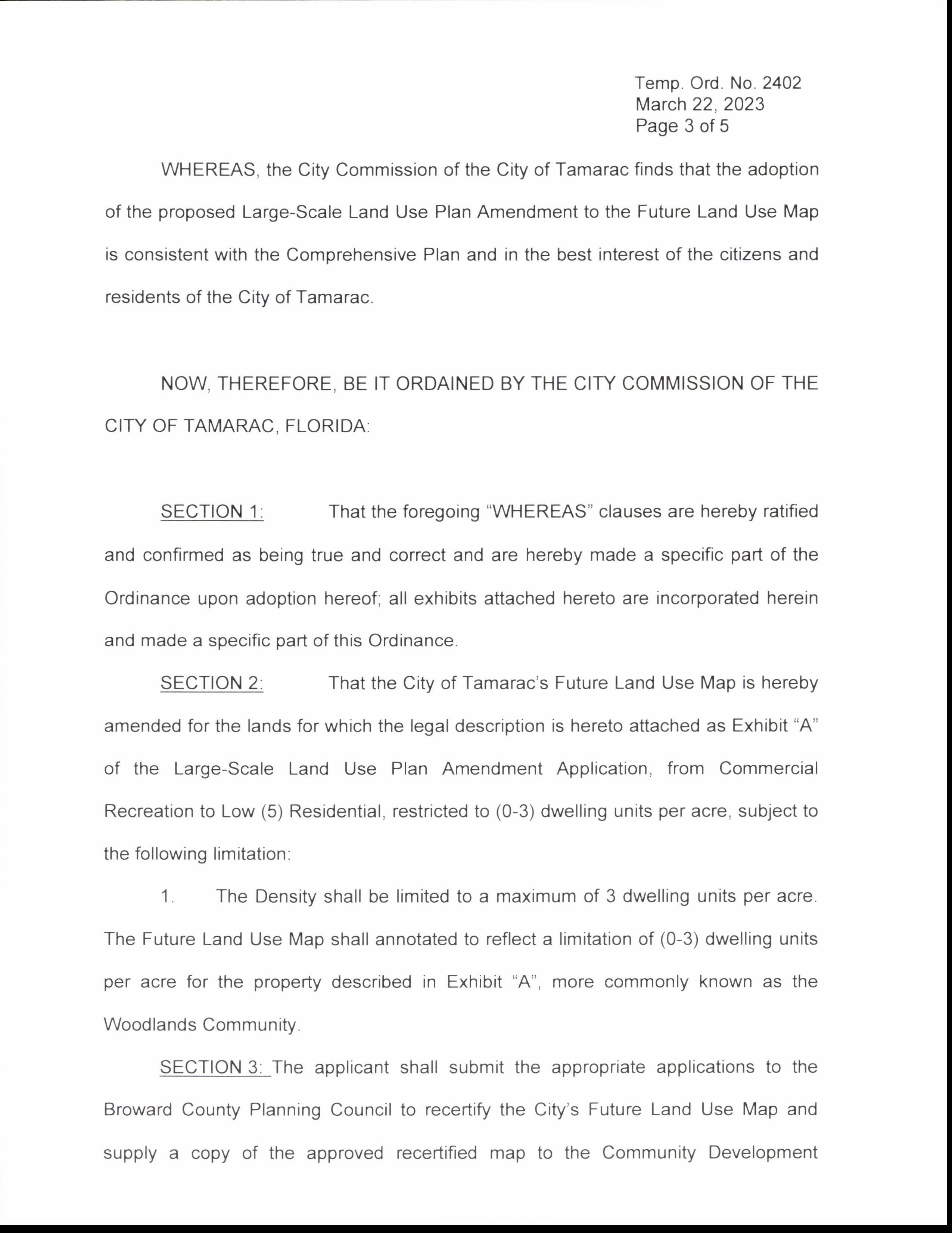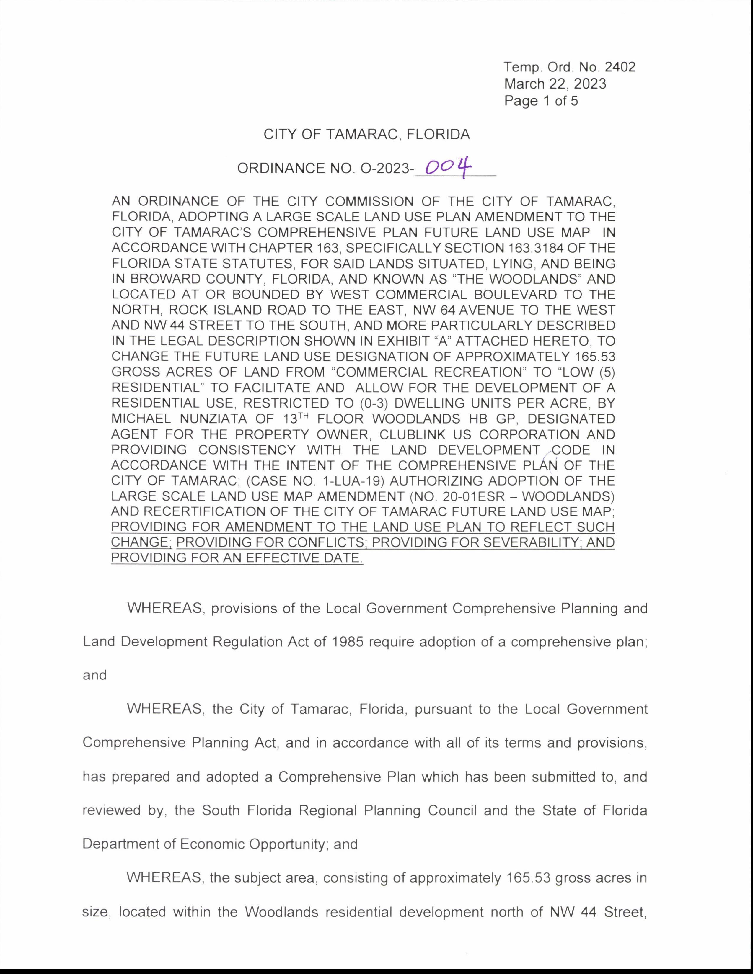 AN ORDINANCE OF THE CITY COMMISSION OF THE CITY OF TAMARAC, FLORIDA, ADOPTING A LARGE SCALE LAND USE PLAN AMENDMENT TO THE CITY OF TAMARAC' S COMPREHENSIVE PLAN FUTURE LAND USE MAP IN ACCORDANCE WITH CHAPTER 163, SPECIFICALLY SECTION 163. 3184 OF THE FLORIDA STATE STATUTES, FOR SAID LANDS SITUATED, LYING, AND BEING IN BROWARD COUNTY, FLORIDA, AND KNOWN AS " THE WOODLANDS" AND LOCATED AT OR BOUNDED BY WEST COMMERCIAL BOULEVARD TO THE NORTH, ROCK ISLAND ROAD TO THE EAST, NW 64 AVENUE TO THE WEST AND NW 44 STREET TO THE SOUTH, AND MORE PARTICULARLY DESCRIBED IN THE LEGAL DESCRIPTION SHOWN IN EXHIBIT " A" ATTACHED HERETO, TO CHANGE THE FUTURE LAND USE DESIGNATION OF APPROXIMATELY 165. 53 GROSS ACRES OF LAND FROM " COMMERCIAL RECREATION" TO " LOW ( 5) RESIDENTIAL" TO FACILITATE AND ALLOW FOR THE DEVELOPMENT OF A RESIDENTIAL USE, RESTRICTED TO ( 0- 3) DWELLING UNITS PER ACRE, BY MICHAEL NUNZIATA OF 13T" FLOOR WOODLANDS HB GP, DESIGNATED AGENT FOR THE PROPERTY OWNER, CLUBLINK US CORPORATION AND PROVIDING CONSISTENCY WITH THE LAND DEVELOPMENT CODE IN ACCORDANCE WITH THE INTENT OF THE COMPREHENSIVE PLAN OF THE CITY OF TAMARAC; ( CASE NO. 1- LUA- 19) AUTHORIZING ADOPTION OF THE LARGE SCALE LAND USE MAP AMENDMENT ( NO. 20- 01 ESR - WOODLANDS) AND RECERTIFICATION OF THE CITY OF TAMARAC FUTURE LAND USE MAP; PROVIDING FOR AMENDMENT TO THE LAND USE PLAN TO REFLECT SUCH CHANGE; PROVIDING FOR CONFLICTS; PROVIDING FOR SEVERABILITY; AND PROVIDING FOR AN EFFECTIVE DATE.
