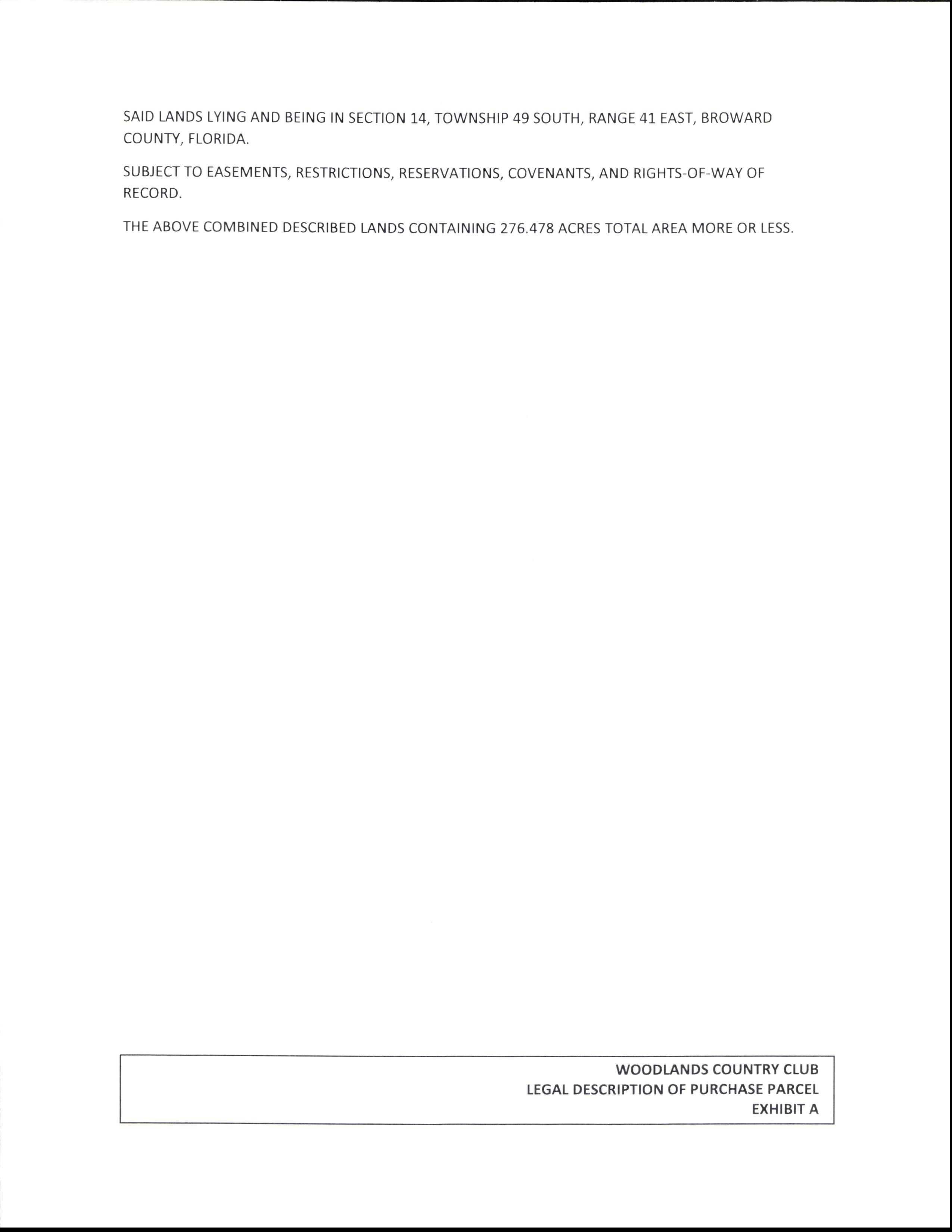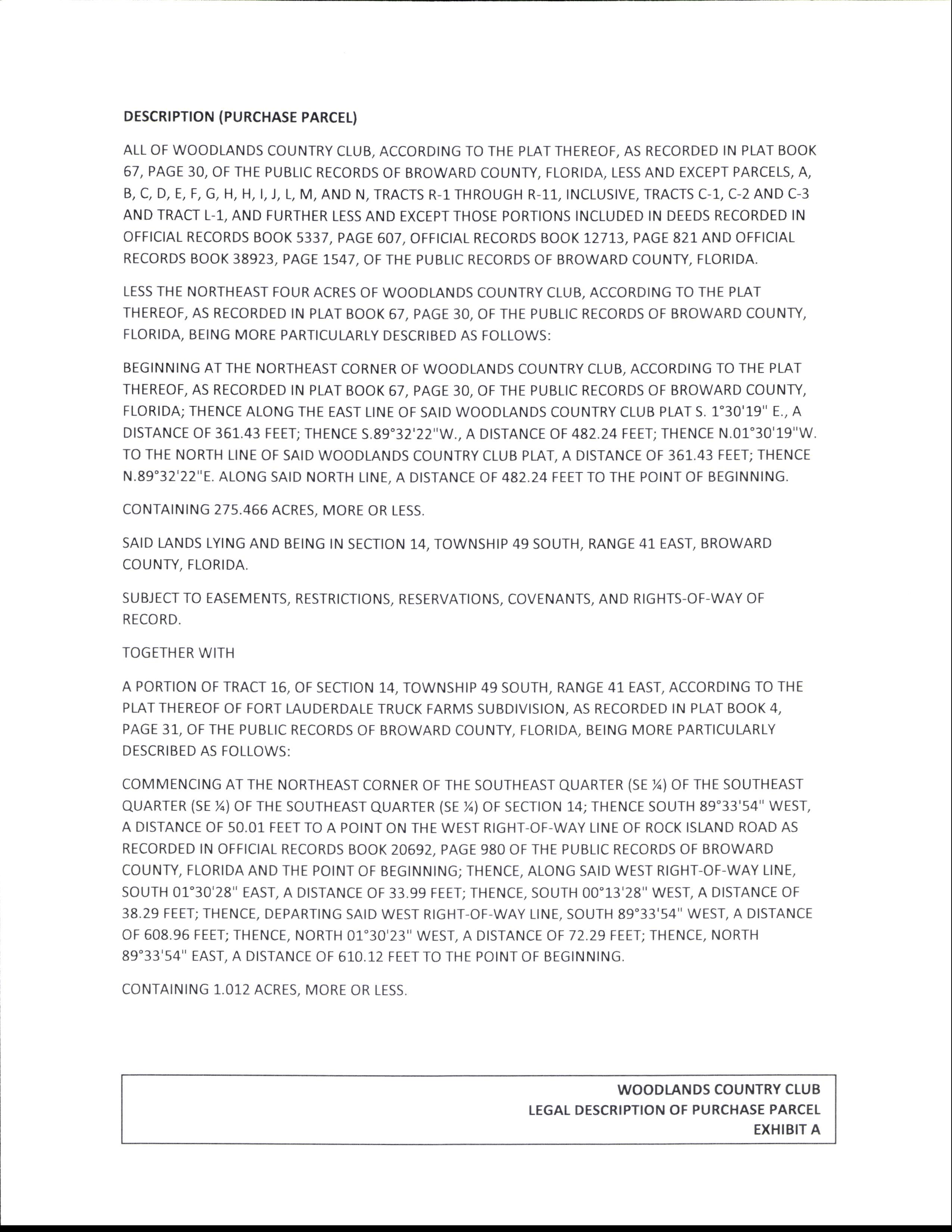 ALL OF WOODLANDS COUNTRY CLUB, ACCORDING TO THE PLAT THEREOF, AS RECORDED IN PLAT BOOK 67, PAGE 30, OF THE PUBLIC RECORDS OF BROWARD COUNTY, FLORIDA, LESS AND EXCEPT PARCELS, A, B, C, D, E, F, G, H, H, I, J, L, M, AND N, TRACTS R- 1 THROUGH R- 11, INCLUSIVE, TRACTS C- 1, C- 2 AND C- 3 AND TRACT L- 1, AND FURTHER LESS AND EXCEPT THOSE PORTIONS INCLUDED IN DEEDS RECORDED IN OFFICIAL RECORDS BOOK 5337, PAGE 607, OFFICIAL RECORDS BOOK 12713, PAGE 821 AND OFFICIAL RECORDS BOOK 38923, PAGE 1547, OF THE PUBLIC RECORDS OF BROWARD COUNTY, FLORIDA.