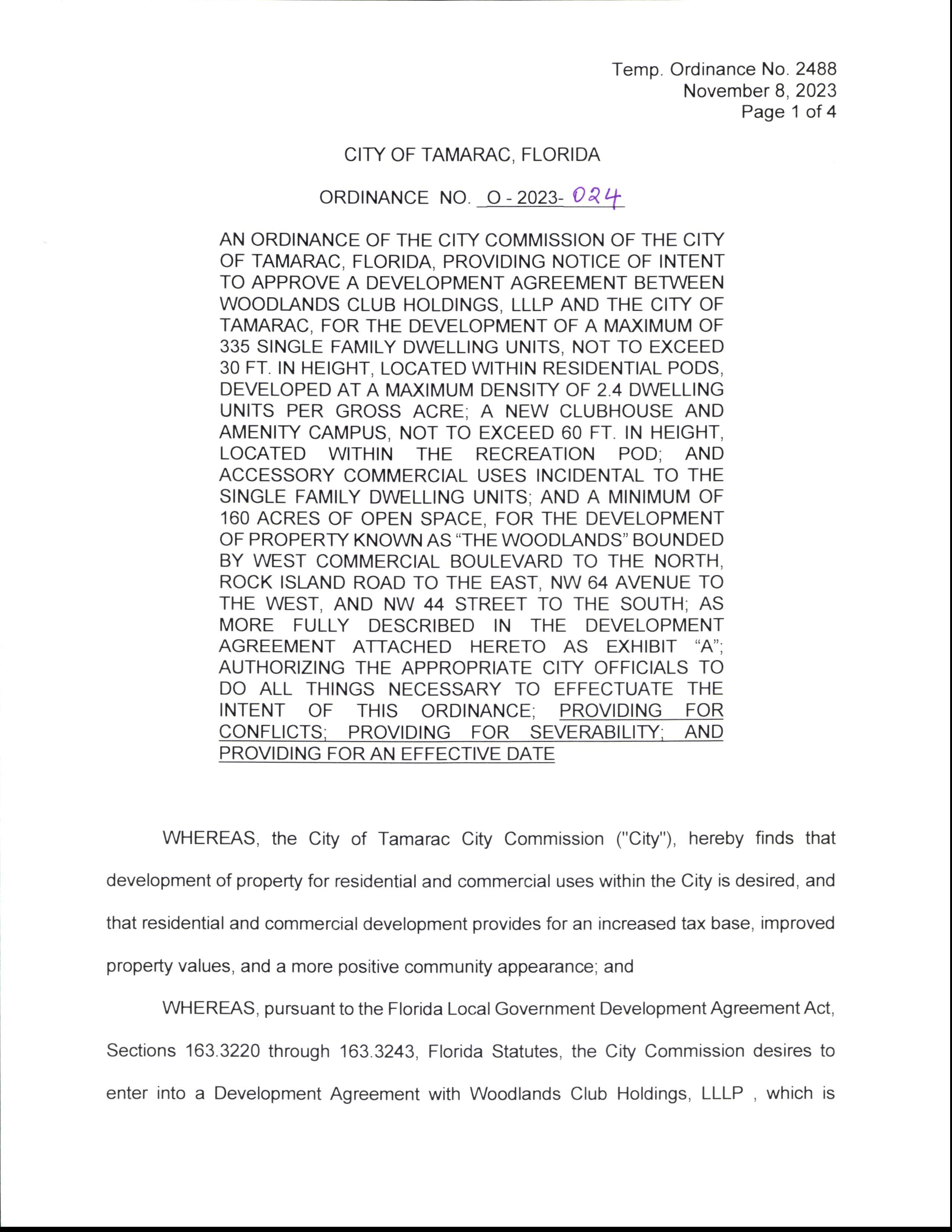 AN ORDINANCE OF THE CITY COMMISSION OF THE CITY OF TAMARAC, FLORIDA, PROVIDING NOTICE OF INTENT TO APPROVE A DEVELOPMENT AGREEMENT BETWEEN WOODLANDS CLUB HOLDINGS, LLLP AND THE CITY OF TAMARAC, FOR THE DEVELOPMENT OF A MAXIMUM OF 335 SINGLE FAMILY DWELLING UNITS, NOT TO EXCEED 30 FT. IN HEIGHT, LOCATED WITHIN RESIDENTIAL PODS, DEVELOPED AT A MAXIMUM DENSITY OF 2.4 DWELLING UNITS PER GROSS ACRE; A NEW CLUBHOUSE AND AMENITY CAMPUS, NOT TO EXCEED 60 FT. IN HEIGHT, LOCATED WITHIN THE RECREATION POD; AND ACCESSORY COMMERCIAL USES INCIDENTAL TO THE SINGLE FAMILY DWELLING UNITS; AND A MINIMUM OF 160 ACRES OF OPEN SPACE, FOR THE DEVELOPMENT OF PROPERTY KNOWN AS " THE WOODLANDS" BOUNDED BY WEST COMMERCIAL BOULEVARD TO THE NORTH, ROCK ISLAND ROAD TO THE EAST, NW 64 AVENUE TO THE WEST, AND NW 44 STREET TO THE SOUTH; AS MORE FULLY DESCRIBED IN THE DEVELOPMENT AGREEMENT ATTACHED HERETO AS EXHIBIT " A"; AUTHORIZING THE APPROPRIATE CITY OFFICIALS TO DO ALL THINGS NECESSARY TO EFFECTUATE THE INTENT OF THIS ORDINANCE; PROVIDING FOR CONFLICTS; PROVIDING FOR SEVERABILITY; AND PROVIDING FOR AN EFFECTIVE DATE