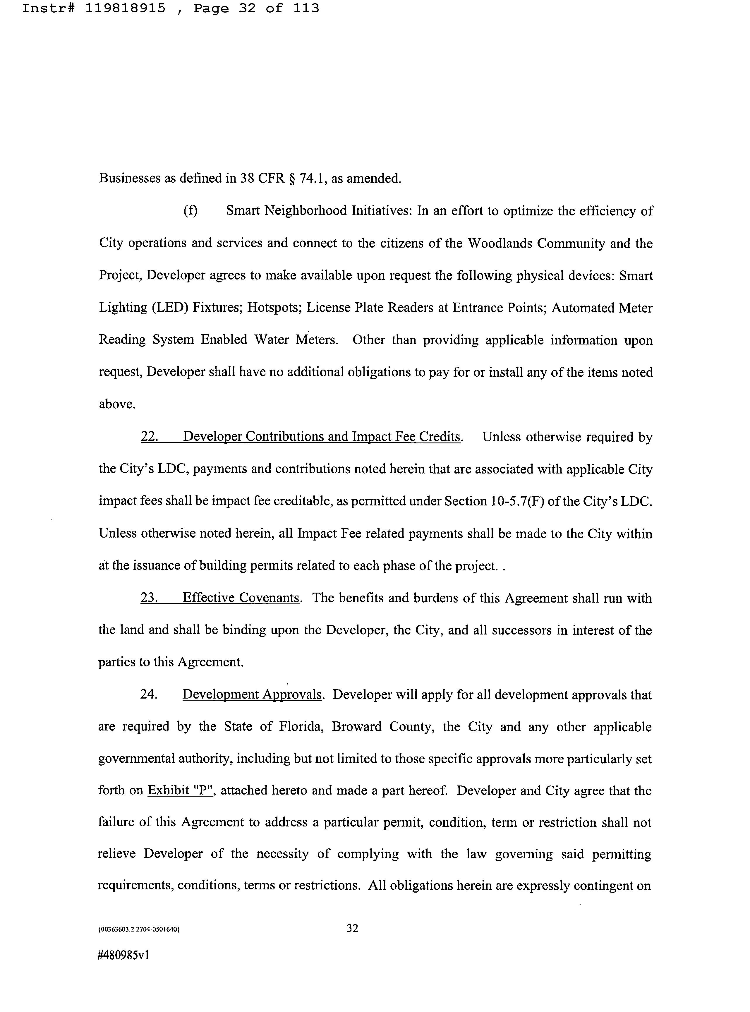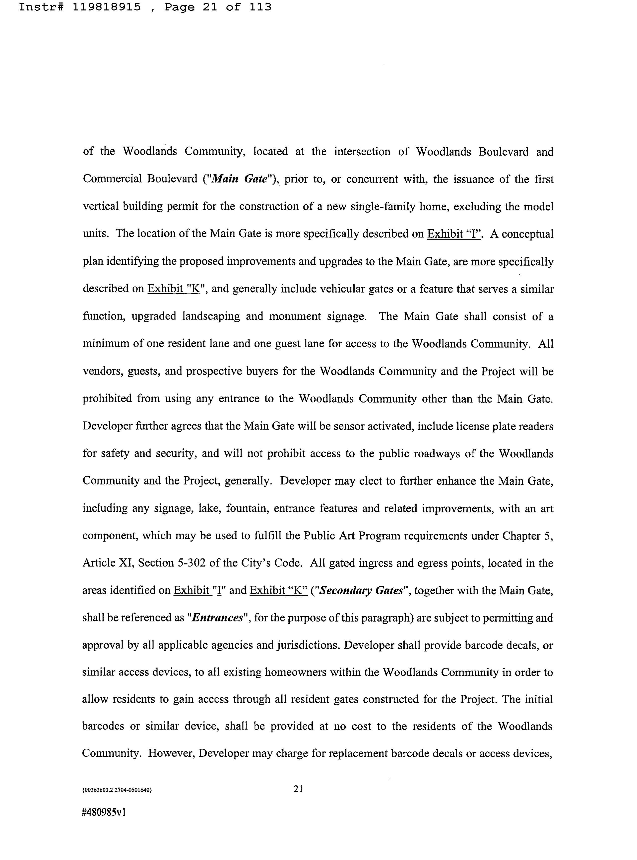 of the Woodlands Community, located at the intersection of Woodlands Boulevard and Commercial Boulevard (" Main Gate"), prior to, or concurrent with, the issuance of the first vertical building permit for the construction of a new single-family home, excluding the model units. The location of the Main Gate is more specifically described on Exhibit " I". A conceptual plan identifying the proposed improvements and upgrades to the Main Gate, are more specifically described on Exhibit " K", and generally include vehicular gates or a feature that serves a similar function, upgraded landscaping and monument signage. The Main Gate shall consist of a minimum of one resident lane and one guest lane for access to the Woodlands Community. All vendors, guests, and prospective buyers for the Woodlands Community and the Project will be prohibited from using any entrance to the Woodlands Community other than the Main Gate. Developer further agrees that the Main Gate will be sensor activated, include license plate readers for safety and security, and will not prohibit access to the public roadways of the Woodlands Community and the Project, generally. Developer may elect to further enhance the Main Gate, including any signage, lake, fountain, entrance features and related improvements, with an art component, which may be used to fulfill the Public Art Program requirements under Chapter 5, Article XI, Section 5- 302 of the City' s Code. All gated ingress and egress points, located in the areas identified on Exhibit "I" and Exhibit " K" (" Secondary Gates", together with the Main Gate, shall be referenced as " Entrances", for the purpose of this paragraph) are subject to permitting and approval by all applicable agencies and jurisdictions. Developer shall provide barcode decals, or similar access devices, to all existing homeowners within the Woodlands Community in order to allow residents to gain access through all resident gates constructed for the Project. The initial barcodes or similar device, shall be provided at no cost to the residents of the Woodlands Community. However, Developer may charge for replacement barcode decals or access devices,
