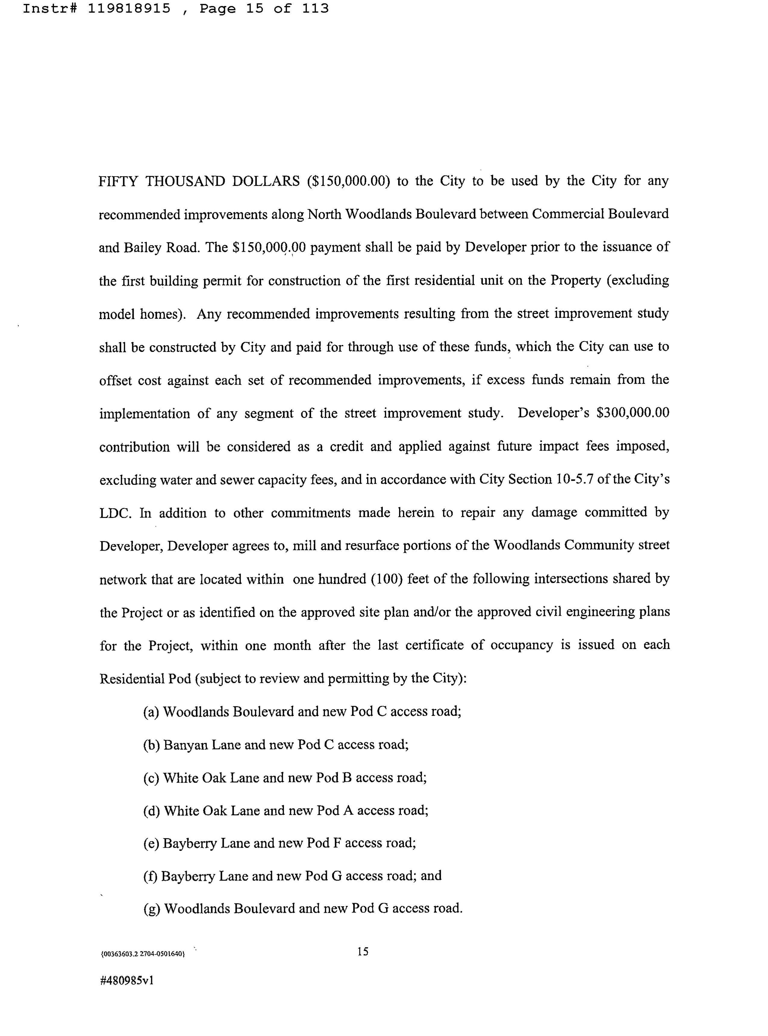 FIFTY THOUSAND DOLLARS ($ 150, 000. 00) to the City to be used by the City for any recommended improvements along North Woodlands Boulevard between Commercial Boulevard and Bailey Road. The $ 150,000.00 payment shall be paid by Developer prior to the issuance of the first building permit for construction of the first residential unit on the Property ( excluding model homes). Any recommended improvements resulting from the street improvement study shall be constructed by City and paid for through use of these funds, which the City can use to offset cost against each set of recommended improvements, if excess funds remain from the implementation of any segment of the street improvement study. Developer' s $ 300, 000. 00 contribution will be considered as a credit and applied against future impact fees imposed, excluding water and sewer capacity fees, and in accordance with City Section 10- 5.7 of the City' s LDC. In addition to other commitments made herein to repair any damage committed by Developer, Developer agrees to, mill and resurface portions of the Woodlands Community street network that are located within one hundred ( 100) feet of the following intersections shared by the Project or as identified on the approved site plan and/ or the approved civil engineering plans for the Project, within one month after the last certificate of occupancy is issued on each