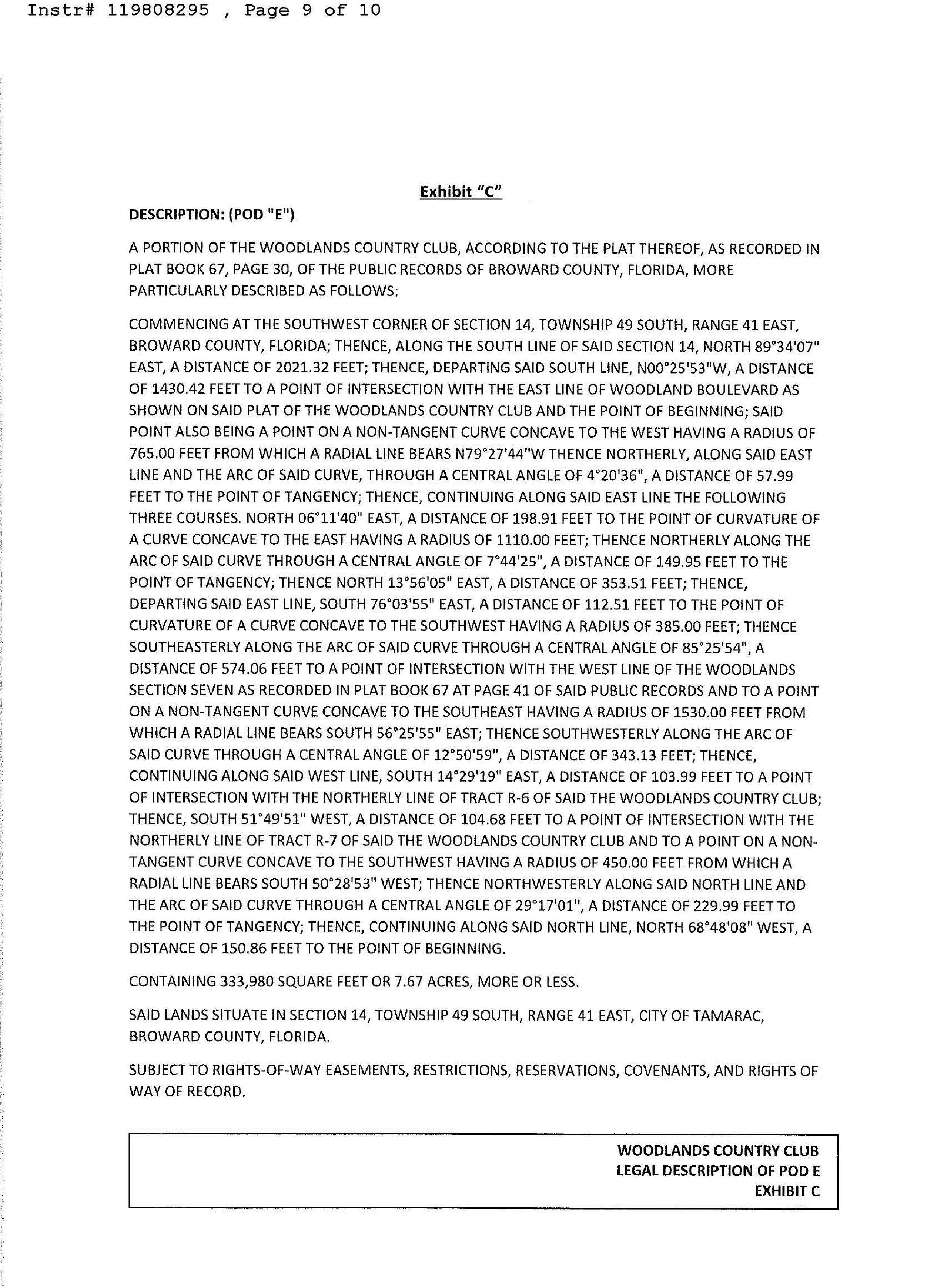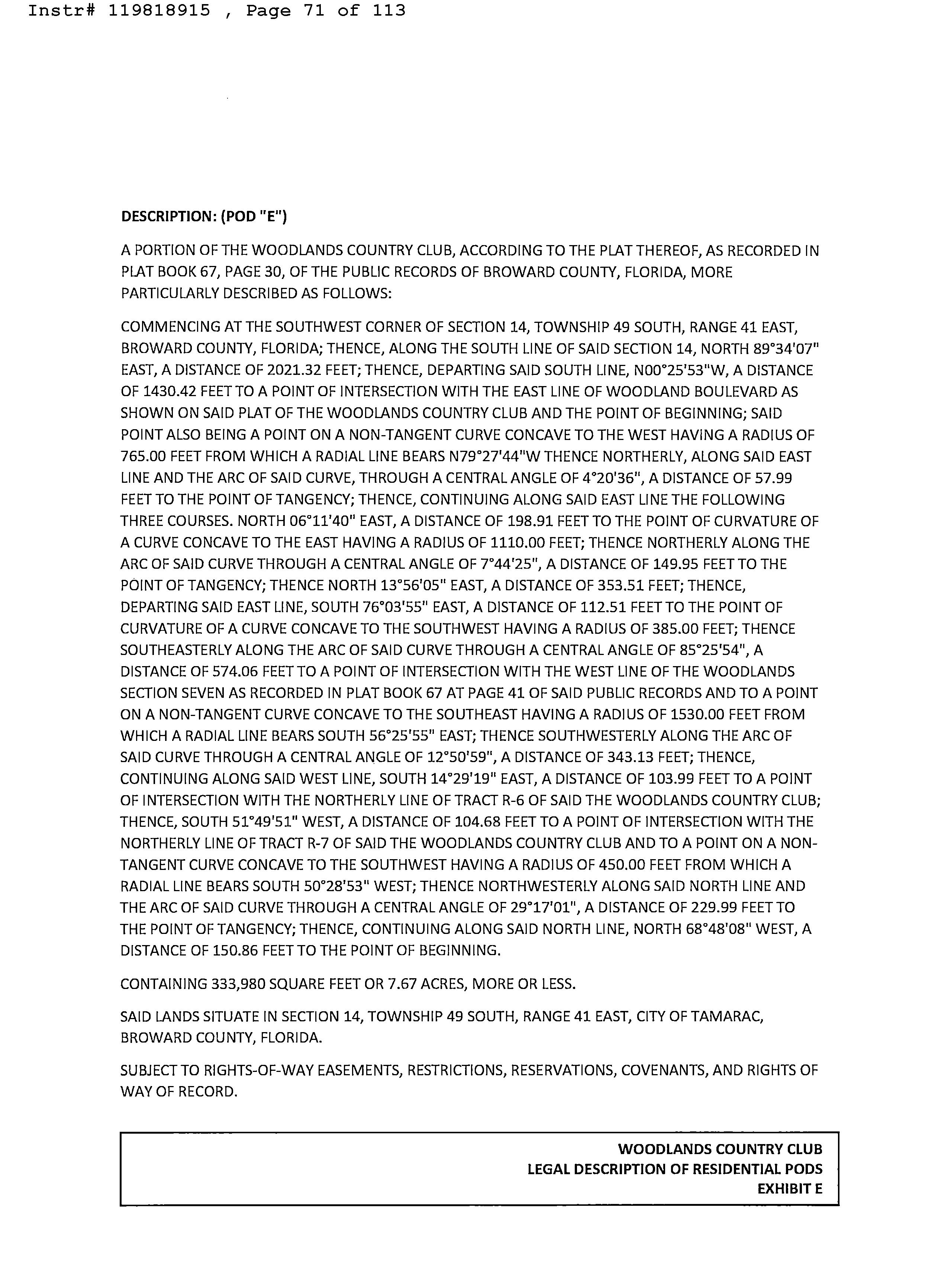 COMMENCING AT THE SOUTHWEST CORNER OF SECTION 14, TOWNSHIP 49 SOUTH, RANGE 41 EAST, BROWARD COUNTY, FLORIDA; THENCE, ALONG THE SOUTH LINE OF SAID SECTION 14, NORTH 89°34'07" EAST, A DISTANCE OF 2021.32 FEET; THENCE, DEPARTING SAID SOUTH LINE, N00°25153"W, A DISTANCE OF 1430.42 FEET TO A POINT OF INTERSECTION WITH THE EAST LINE OF WOODLAND BOULEVARD AS SHOWN ON SAID PLAT OF THE WOODLANDS COUNTRY CLUB AND THE POINT OF BEGINNING; SAID POINT ALSO BEING A POINT ON A NON -TANGENT CURVE CONCAVE TO THE WEST HAVING A RADIUS OF 765.00 FEET FROM WHICH A RADIAL LINE BEARS N79°27'44"W THENCE NORTHERLY, ALONG SAID EAST LINE AND THE ARC OF SAID CURVE, THROUGH A CENTRAL ANGLE OF 4°20136, A DISTANCE OF 57.99 FEET TO THE POINT OF TANGENCY; THENCE, CONTINUING ALONG SAID EAST LINE THE FOLLOWING THREE COURSES, NORTH 06011140" EAST, A DISTANCE OF 198.91 FEET TO THE POINT OF CURVATURE OF A CURVE CONCAVE TO THE EAST HAVING A RADIUS OF 1110.00 FEET; THENCE NORTHERLY ALONG THE ARC OF SAID CURVE THROUGH A CENTRAL ANGLE OF T44'25, A DISTANCE OF 149.95 FEET TO THE POINT OF TANGENCY; THENCE NORTH 1305605" EAST, A DISTANCE OF 353.51 FEET; THENCE, DEPARTING SAID EAST LINE, SOUTH 7600355" EAST, A DISTANCE OF 112.51 FEET TO THE POINT OF CURVATURE OF A CURVE CONCAVE TO THE SOUTHWEST HAVING A RADIUS OF 385.00 FEET; THENCE SOUTHEASTERLY ALONG THE ARC OF SAID CURVE THROUGH A CENTRAL ANGLE OF 85°25'54, A DISTANCE OF 574.06 FEET TO A POINT OF INTERSECTION WITH THE WEST LINE OF THE WOODLANDS SECTION SEVEN AS RECORDED IN PLAT BOOK 67 AT PAGE 41 OF SAID PUBLIC RECORDS AND TO A POINT ON A NON -TANGENT CURVE CONCAVE TO THE SOUTHEAST HAVING A RADIUS OF 1530.00 FEET FROM WHICH A RADIAL LINE BEARS SOUTH 56°25'55" EAST; THENCE SOUTHWESTERLY ALONG THE ARC OF SAID CURVE THROUGH A CENTRAL ANGLE OF 12°50'59", A DISTANCE OF 343.13 FEET; THENCE, CONTINUING ALONG SAID WEST LINE, SOUTH 14°29'19" EAST, A DISTANCE OF 103.99 FEET TO A POINT OF INTERSECTION WITH THE NORTHERLY LINE OF TRACT R-6 OF SAID THE WOODLANDS COUNTRY CLUB; THENCE, SOUTH 51°49'51" WEST, A DISTANCE OF 104.68 FEET TO A POINT OF INTERSECTION WITH THE NORTHERLY LINE OF TRACT R-7 OF SAID THE WOODLANDS COUNTRY CLUB AND TO A POINT ON A NONTANGENT CURVE CONCAVE TO THE SOUTHWEST HAVING A RADIUS OF 450.00 FEET FROM WHICH A RADIAL LINE BEARS SOUTH 5002853" WEST; THENCE NORTHWESTERLY ALONG SAID NORTH LINE AND THE ARC OF SAID CURVE THROUGH A CENTRAL ANGLE OF 2901701, A DISTANCE OF 229.99 FEET TO THE POINT OF TANGENCY; THENCE, CONTINUING ALONG SAID NORTH LINE, NORTH 68048108" WEST, A DISTANCE OF 150.86 FEET TO THE POINT OF BEGINNING, CONTAINING 333,980 SQUARE FEET OR 7.67 ACRES, MORE OR LESS.