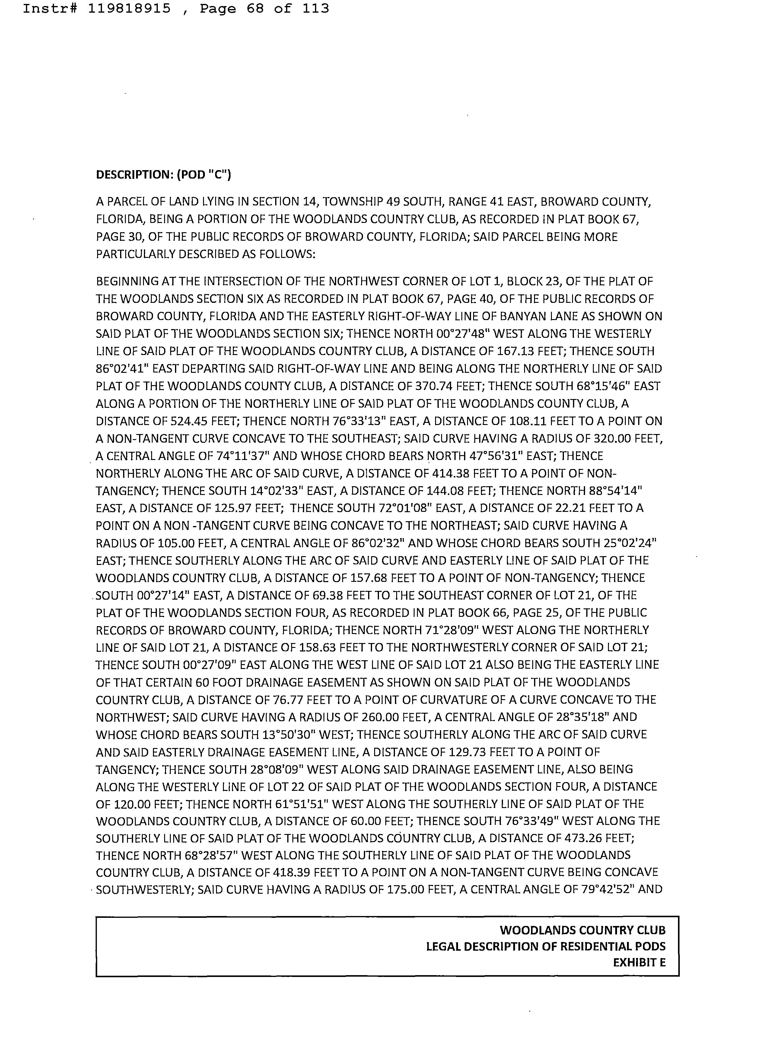 A PORTION OF THE WOODLANDS COUNTRY CLUB, ACCORDING TO THE PLAT THEREOF, AS RECORDED IN PLAT BOOK 67, PAGE 30, OF THE PUBLIC RECORDS OF BROWARD COUNTY, FLORIDA, MORE PARTICULARLY DESCRIBED AS FOLLOWS;
