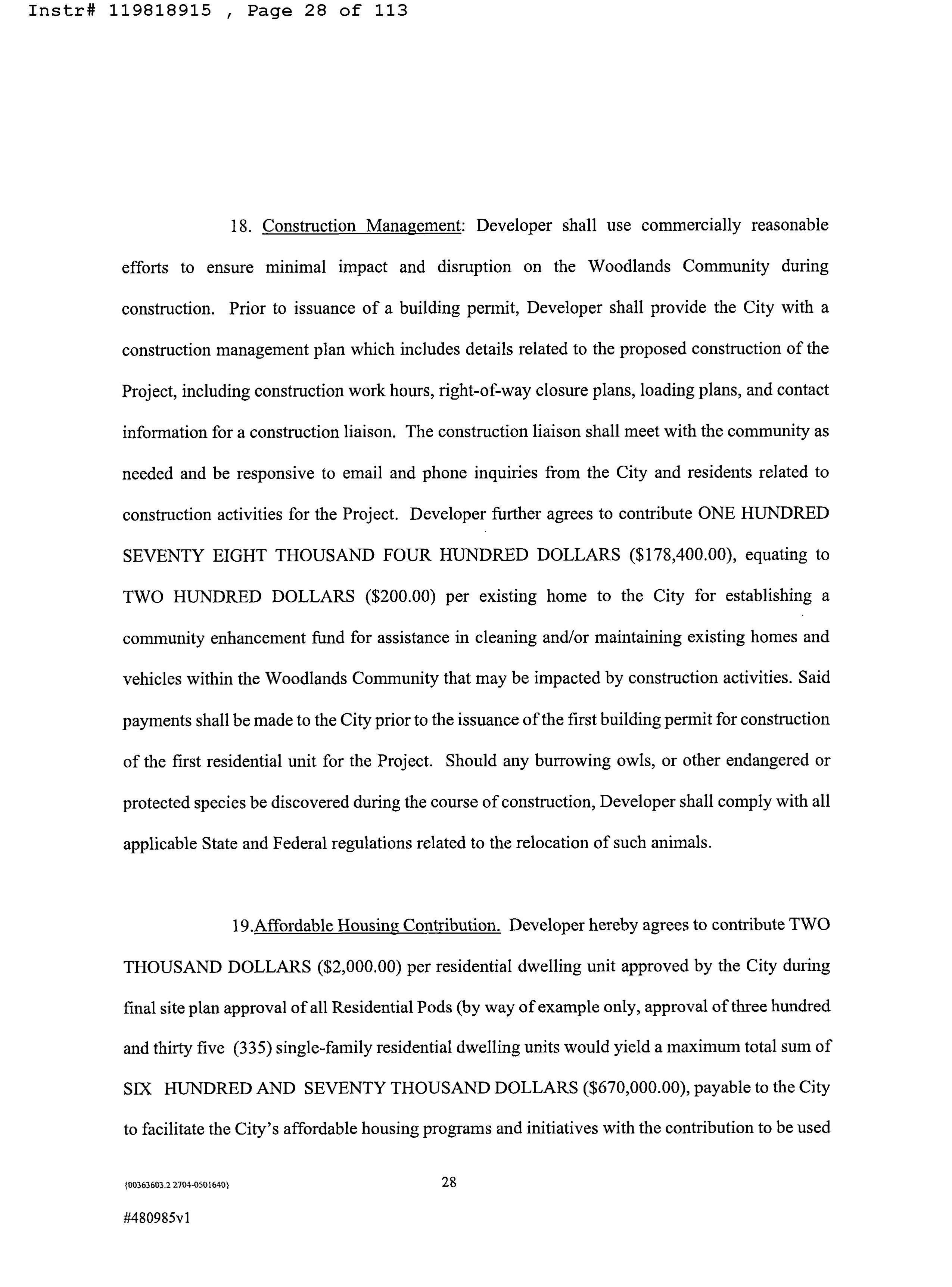 18. Construction Management: Developer shall use commercially reasonable efforts to ensure minimal impact and disruption on the Woodlands Community during construction. Prior to issuance of a building permit, Developer shall provide the City with a construction management plan which includes details related to the proposed construction of the Project, including construction work hours, right- of-way closure plans, loading plans, and contact information for a construction liaison. The construction liaison shall meet with the community as needed and be responsive to email and phone inquiries from the City and residents related to construction activities for the Project. Developer further agrees to contribute ONE HUNDRED SEVENTY EIGHT THOUSAND FOUR HUNDRED DOLLARS ($ 178, 400. 00), equating to TWO HUNDRED DOLLARS ($ 200.00) per existing home to the City for establishing a community enhancement fund for assistance in cleaning and/or maintaining existing homes and vehicles within the Woodlands Community that may be impacted by construction activities. Said payments shall be made to the City prior to the issuance ofthe first building permit for construction of the first residential unit for the Project. Should any burrowing owls, or other endangered or protected species be discovered during the course of construction, Developer shall comply with all applicable State and Federal regulations related to the relocation of such animals.