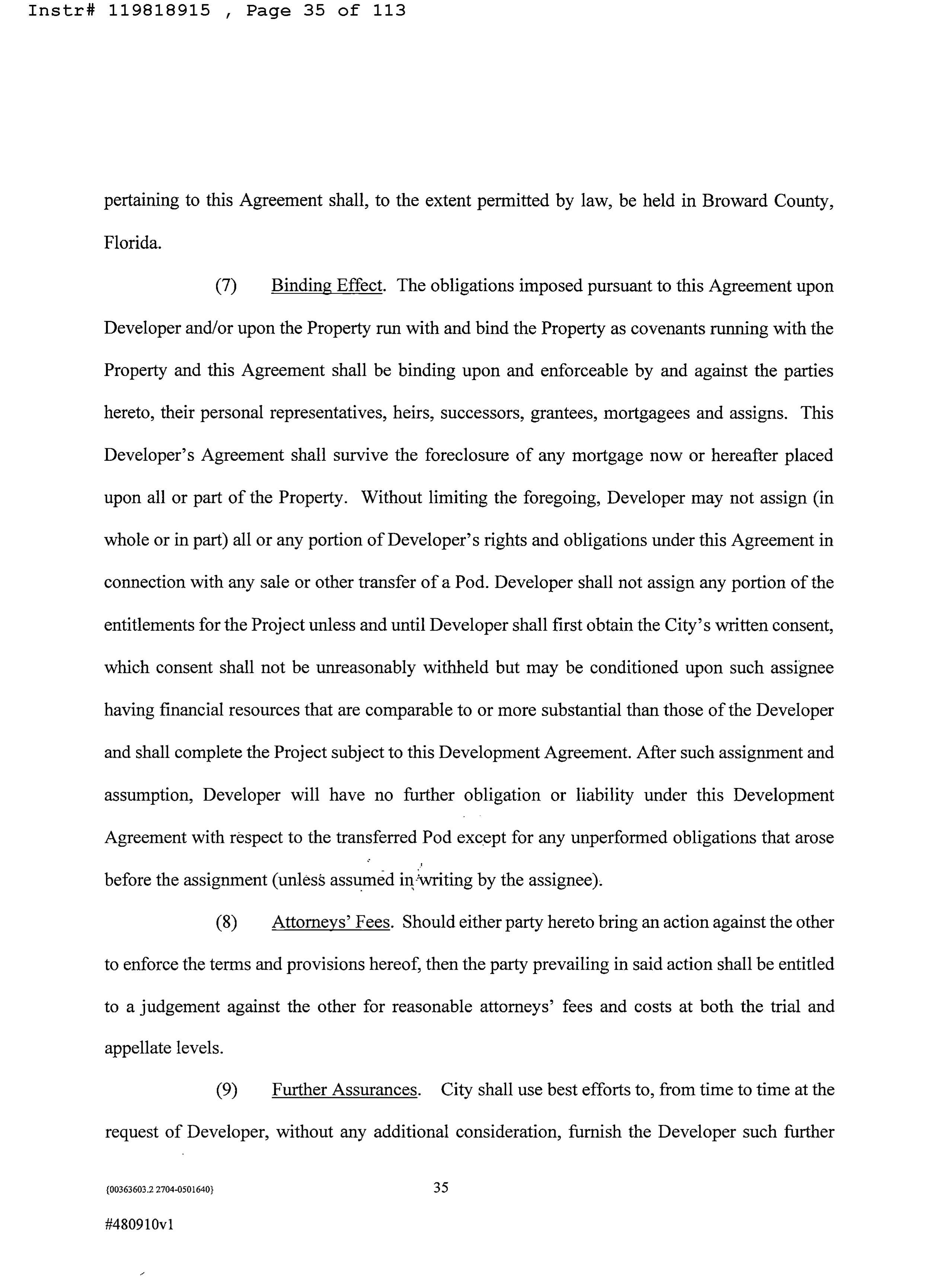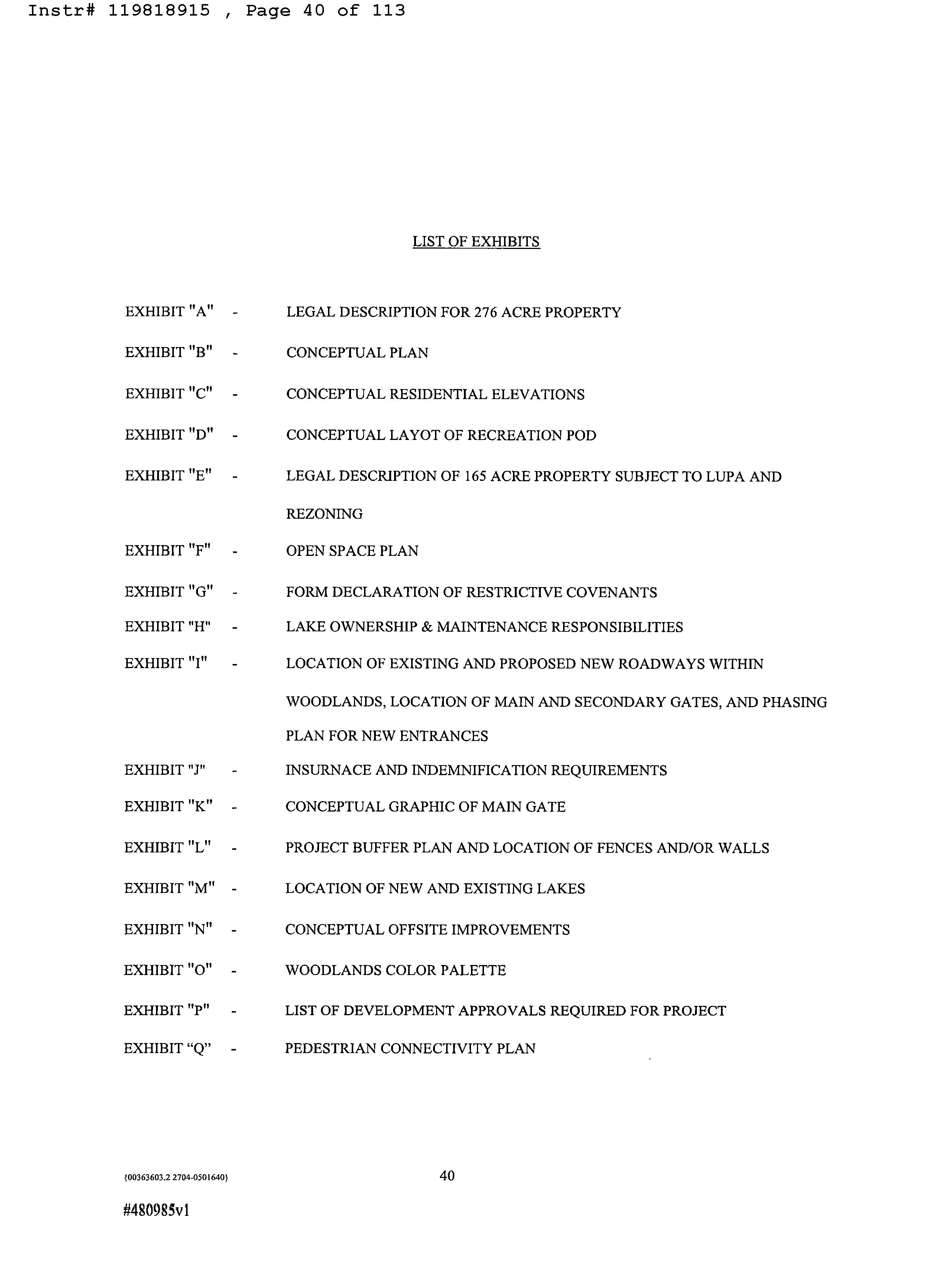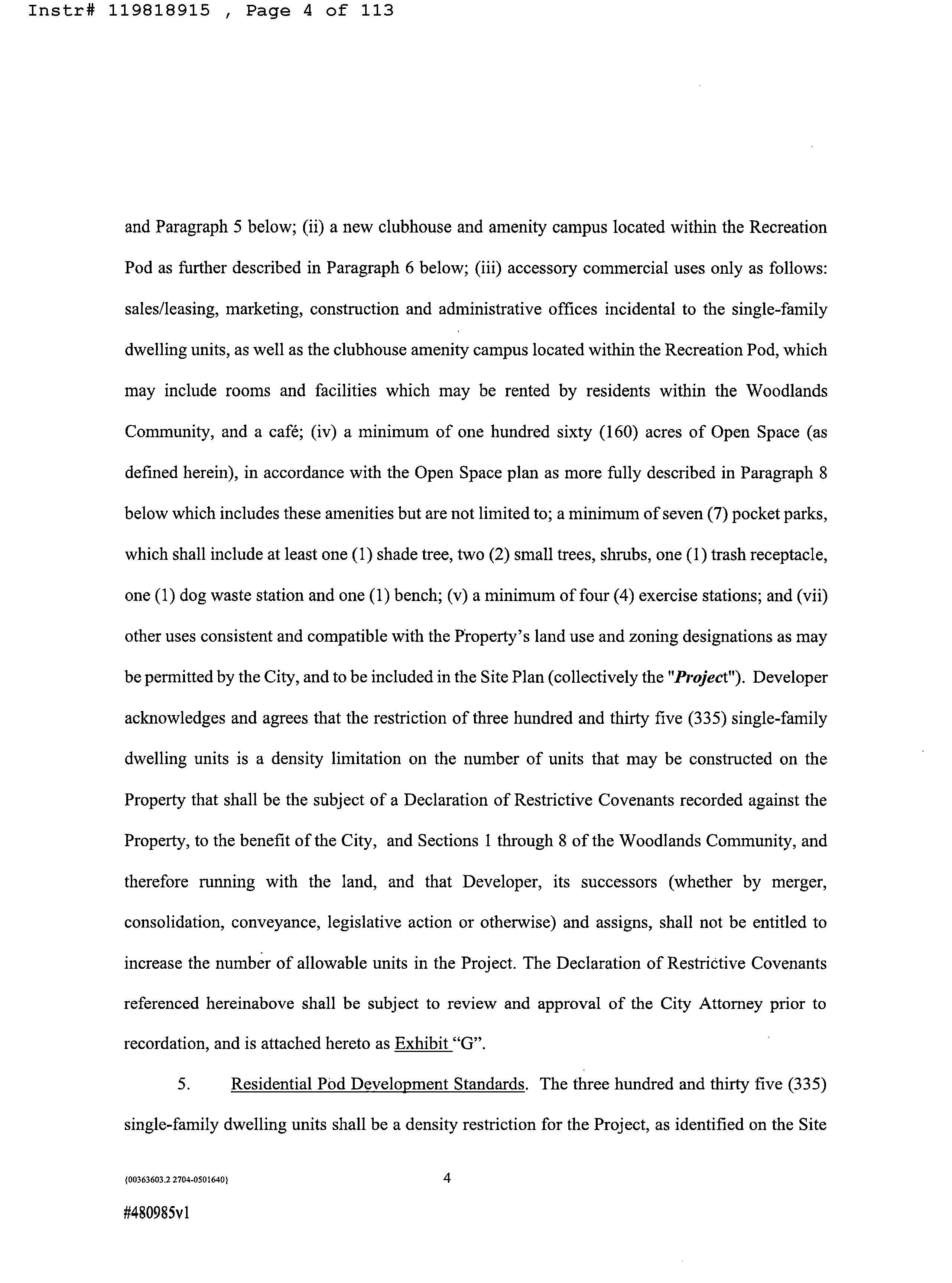 and Paragraph 5 below; ( ii) a new clubhouse and amenity campus located within the Recreation Pod as further described in Paragraph 6 below; ( iii) accessory commercial uses only as follows: sales/ leasing, marketing, construction and administrative offices incidental to the single- family dwelling units, as well as the clubhouse amenity campus located within the Recreation Pod, which may include rooms and facilities which may be rented by residents within the Woodlands Community, and a cafe; ( iv) a minimum of one hundred sixty ( 160) acres of Open Space ( as defined herein), in accordance with the Open Space plan as more fully described in Paragraph 8 below which includes these amenities but are not limited to; a minimum of seven ( 7) pocket parks, which shall include at least one ( 1) shade tree, two ( 2) small trees, shrubs, one ( 1) trash receptacle, one ( 1) dog waste station and one ( 1) bench; ( v) a minimum of four (4) exercise stations; and ( vii) other uses consistent and compatible with the Property' s land use and zoning designations as may be permitted by the City, and to be included in the Site Plan (collectively the "Project"). Developer acknowledges and agrees that the restriction ofthree hundred and thirty five (335) single-family dwelling units is a density limitation on the number of units that may be constructed on the Property that shall be the subject of a Declaration of Restrictive Covenants recorded against the Property, to the benefit of the City, and Sections 1 through 8 of the Woodlands Community, and therefore running with the land, and that Developer, its successors ( whether by merger, consolidation, conveyance, legislative action or otherwise) and assigns, shall not be entitled to increase the number of allowable units in the Project. The Declaration of Restrictive Covenants referenced hereinabove shall be subject to review and approval of the City Attorney prior to recordation, and is attached hereto as Exhibit " G".