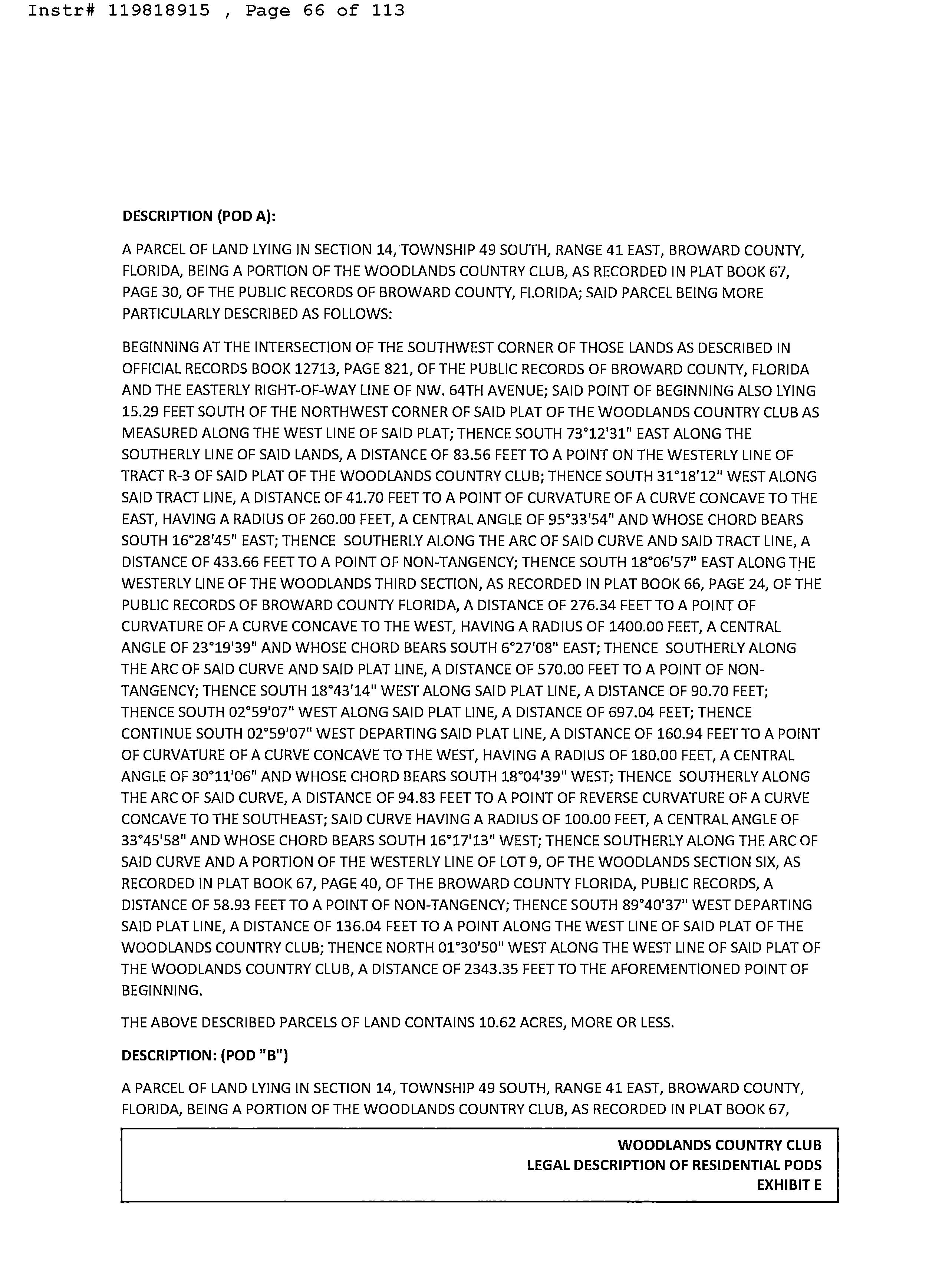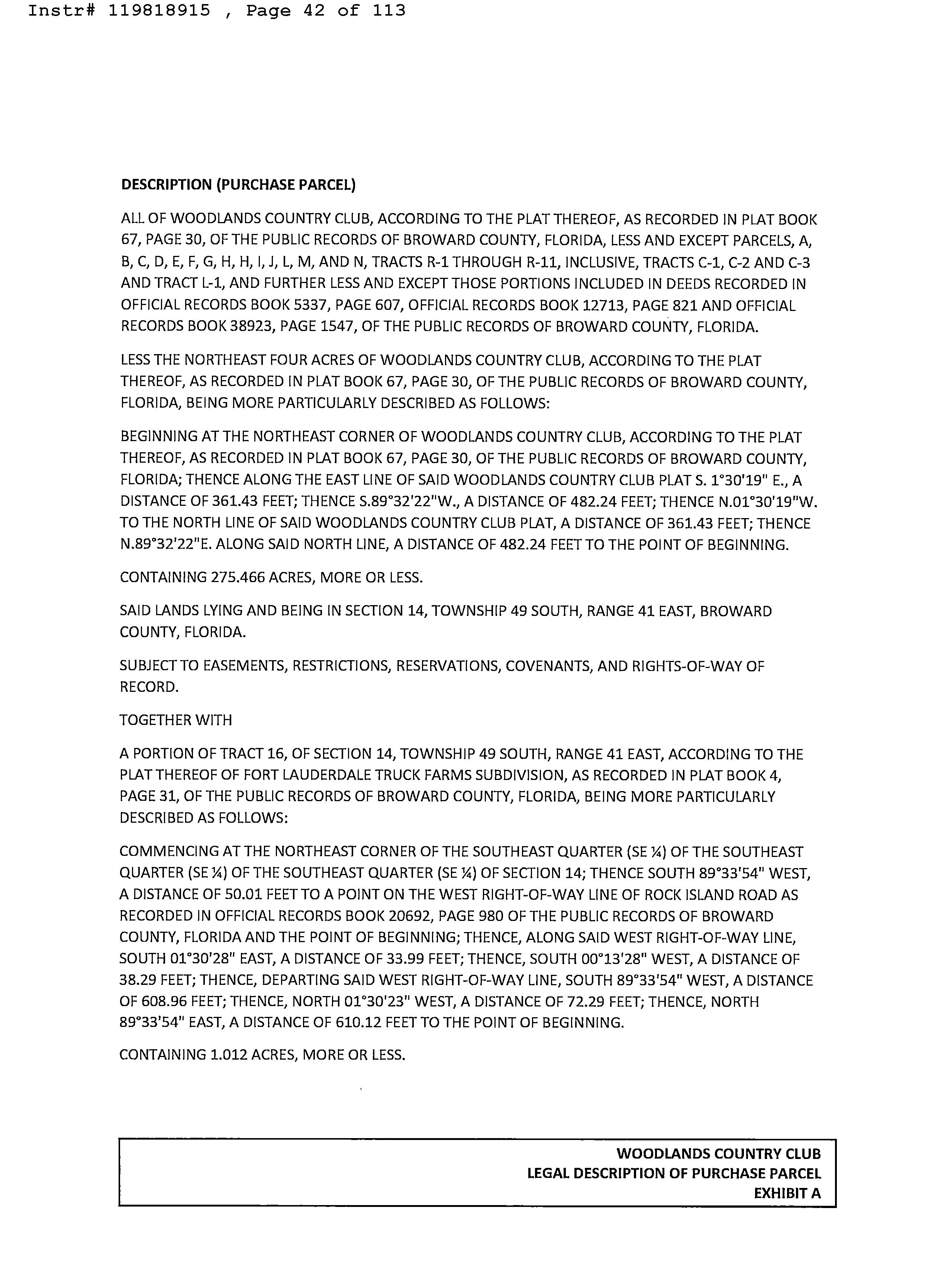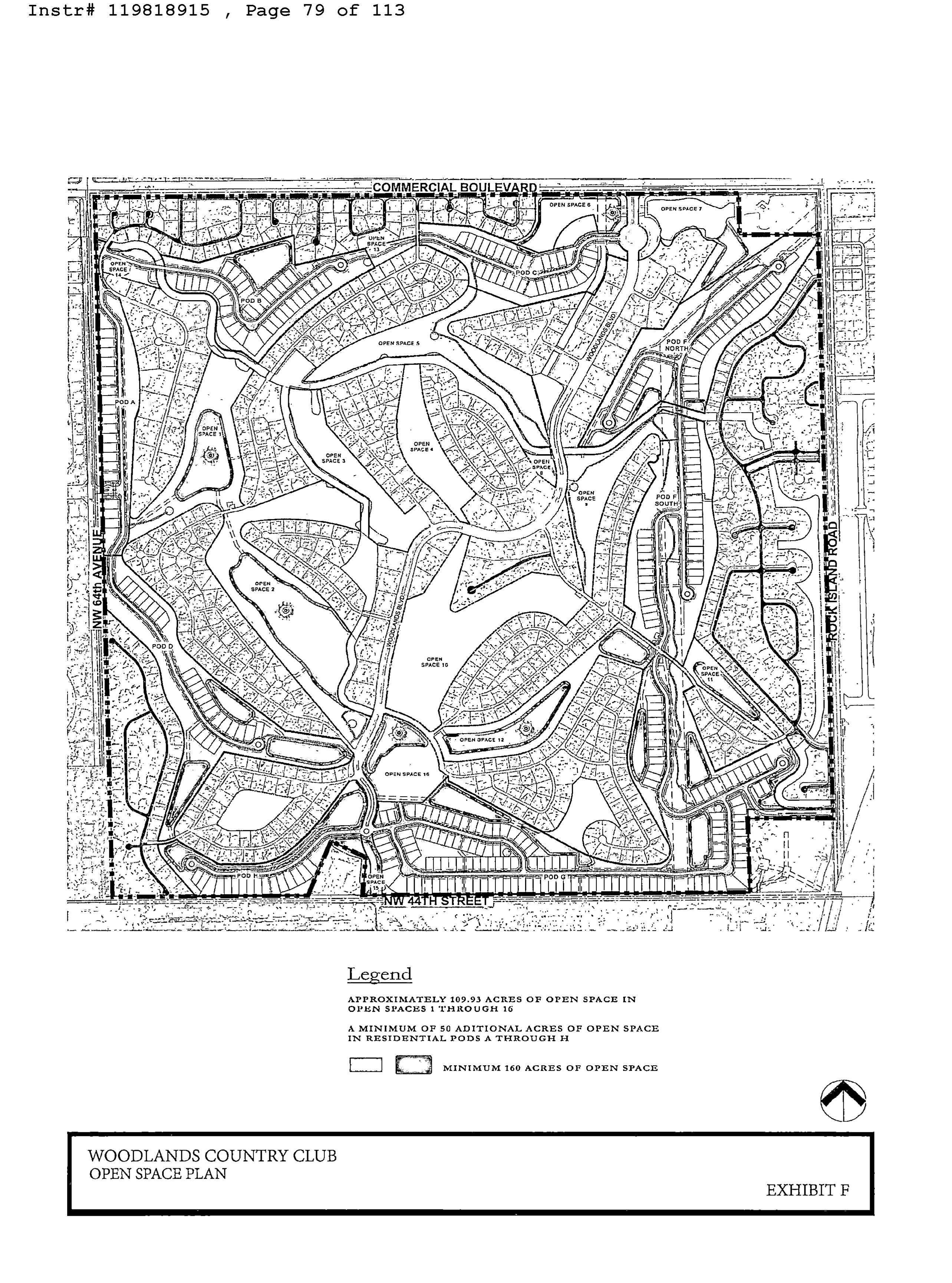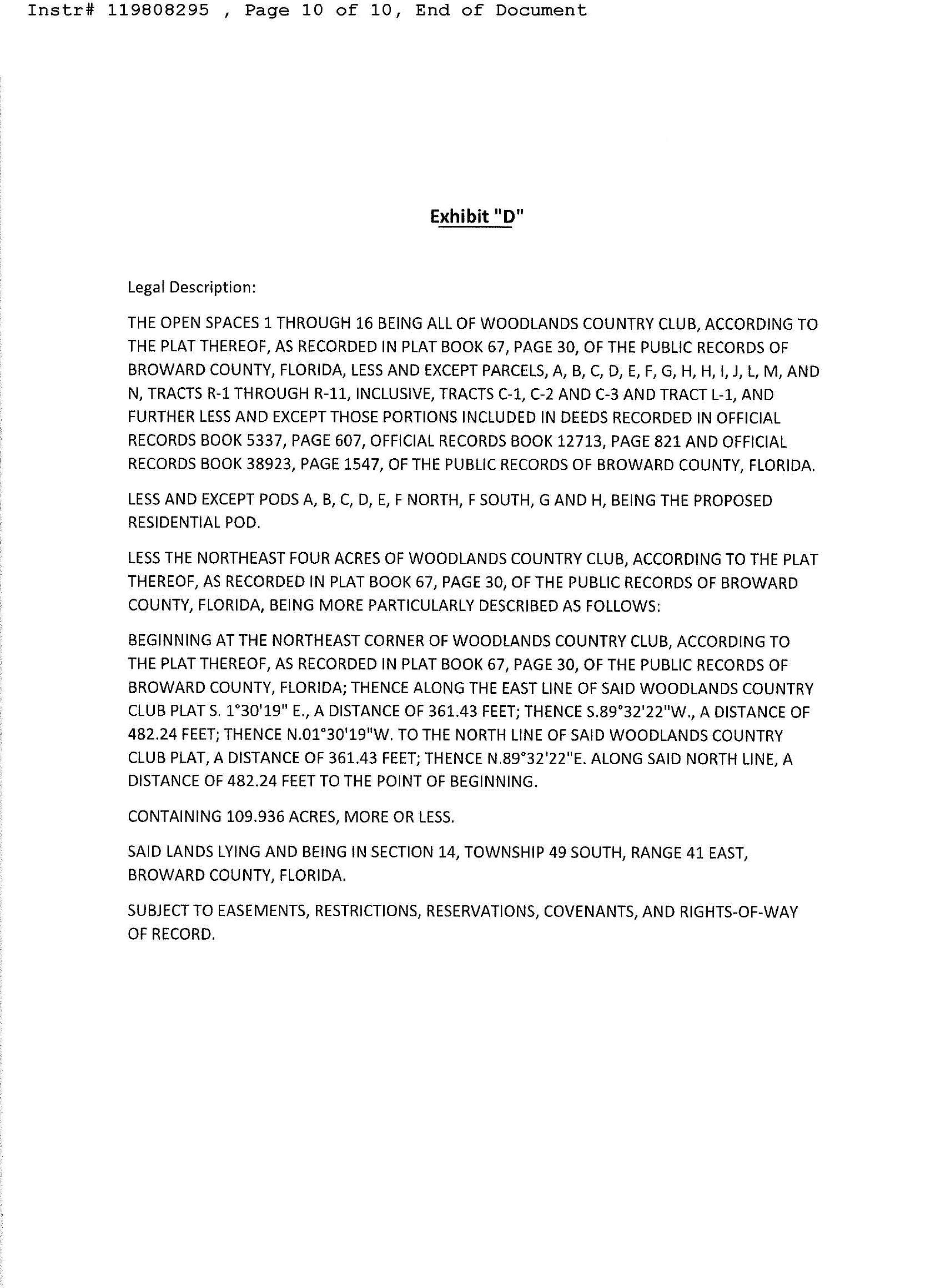 THE OPEN SPACES 1 THROUGH 16 BEING ALL OF WOODLANDS COUNTRY CLUB, ACCORDING TO THE PLAT THEREOF, AS RECORDED IN PLAT BOOK 67, PAGE 30, OF THE PUBLIC RECORDS OF BROWARD COUNTY, FLORIDA, LESS AND EXCEPT PARCELS, A, B, C, D, E, F, G, H, H, I, J, L, M, AND N, TRACTS R-1 THROUGH R-11, INCLUSIVE, TRACTS C-1, C-2 AND C-3 AND TRACT L-1, AND FURTHER LESS AND EXCEPT THOSE PORTIONS INCLUDED IN DEEDS RECORDED IN OFFICIAL RECORDS BOOK 5337, PAGE 607, OFFICIAL RECORDS BOOK 12713, PAGE 821 AND OFFICIAL RECORDS BOOK 38923, PAGE 1547, OF THE PUBLIC RECORDS OF BROWARD COUNTY, FLORIDA.
